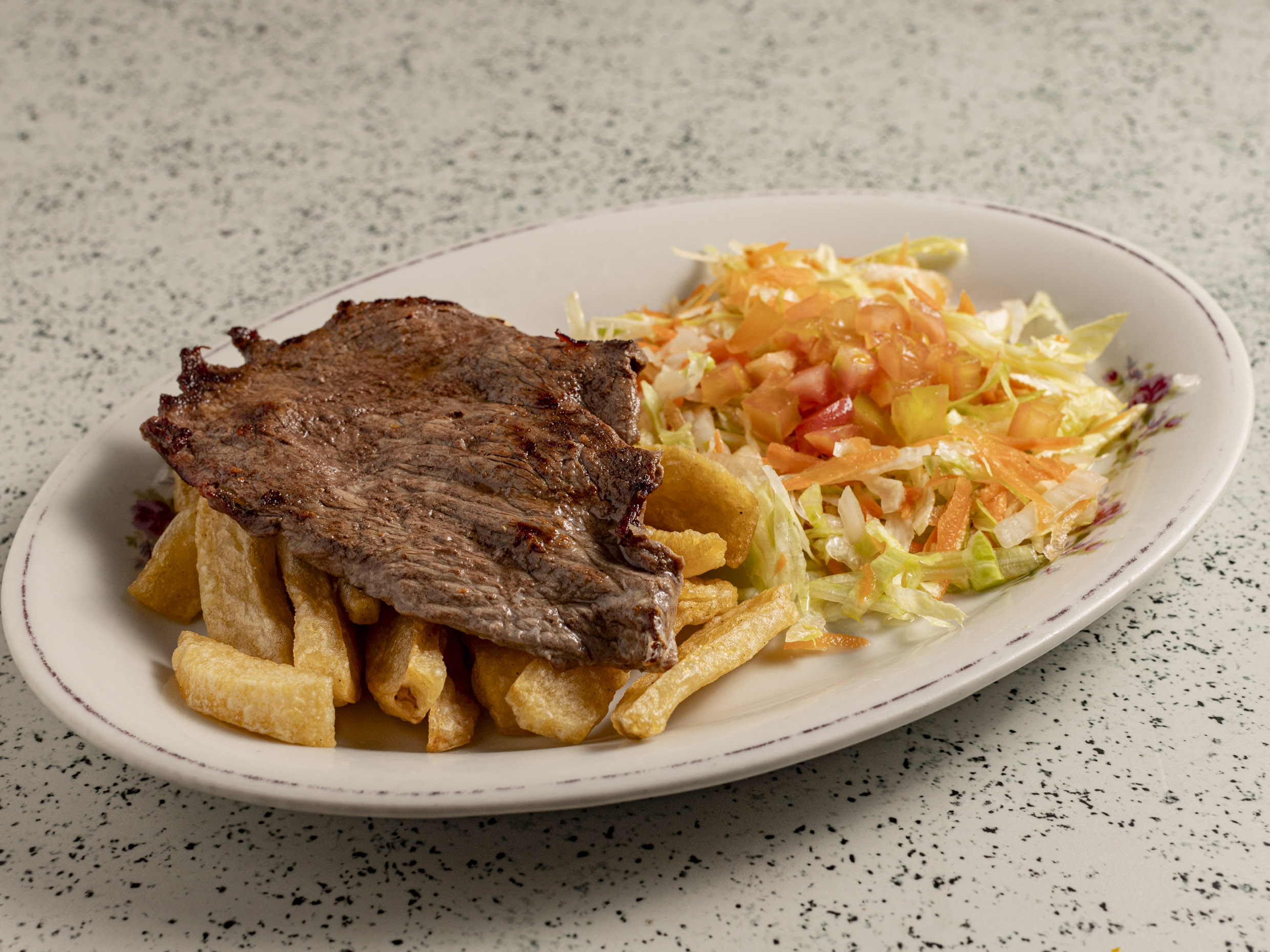 Carne de res a la plancha, acompañada de papitas fritas, ensalada (tomate, lechuga), arepa y sobremesa.