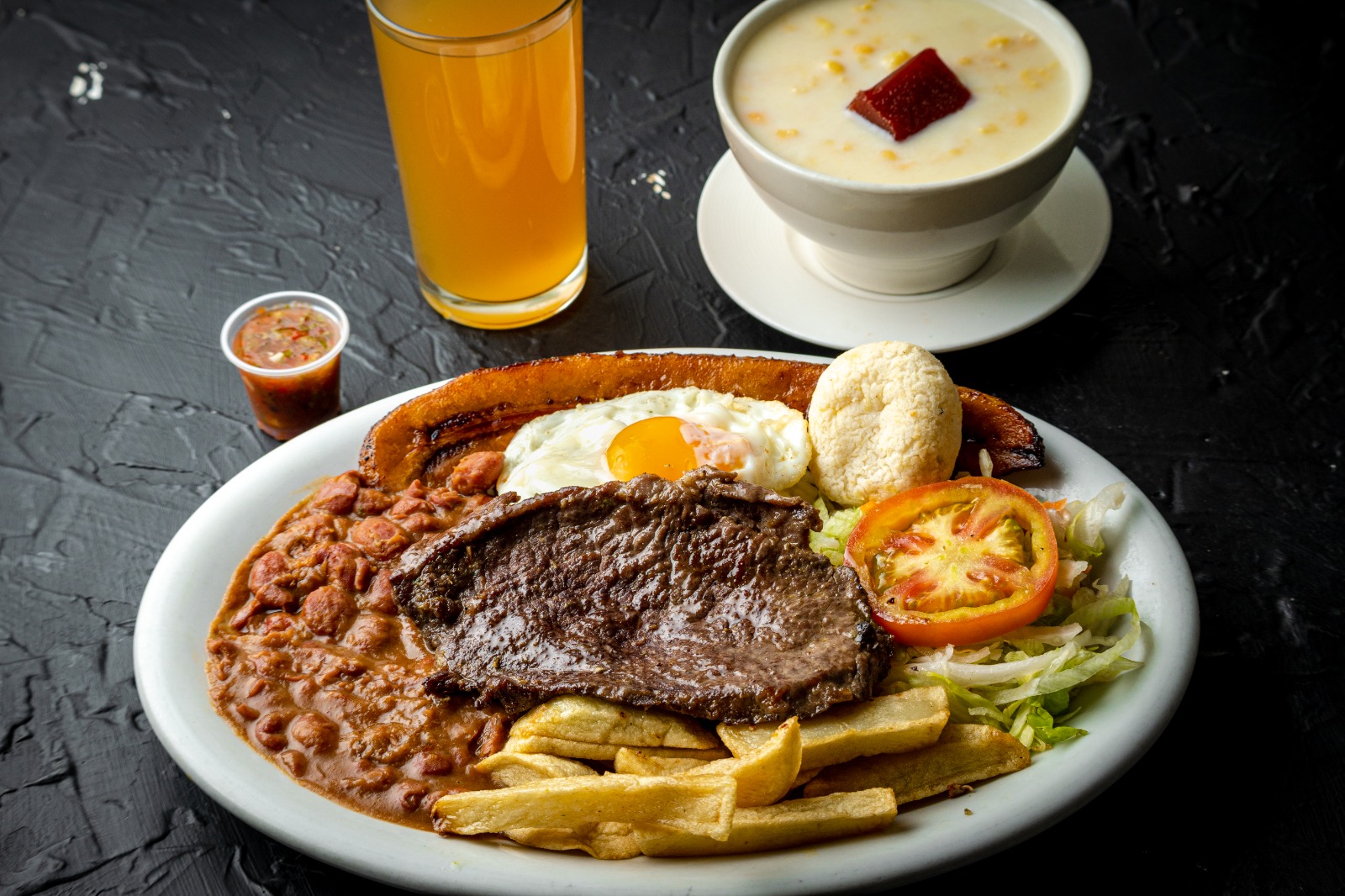 Bandeja con carne de res, arroz blanco, ensalada (tomate, cebolla, lechuga), papitas, tajada, huevo, sopa de frijol y bebida (limonada natural).