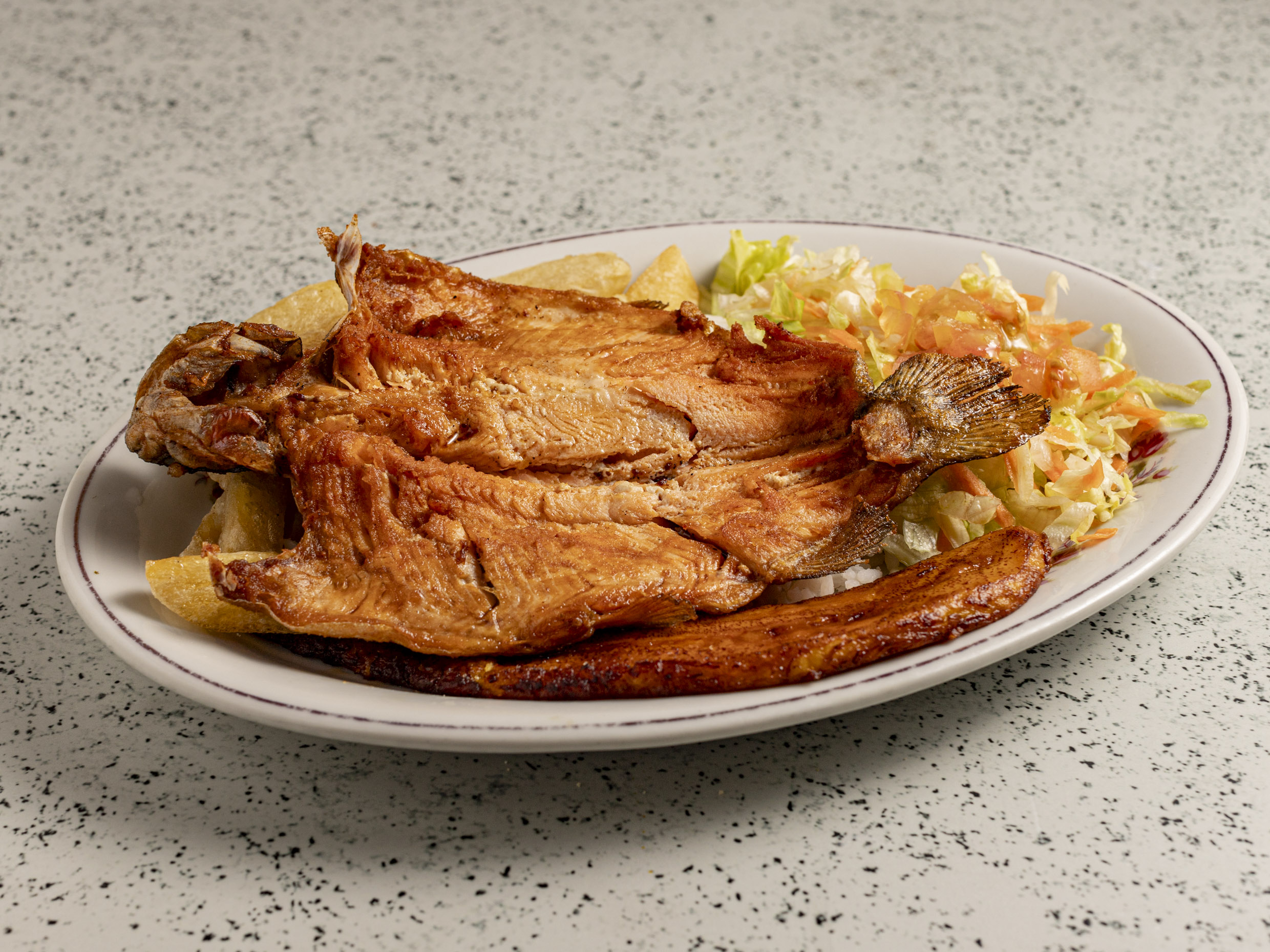 Bandeja con rodaja de pescado frito, acompañada de sopa de pescado, arroz blanco, ensalada (tomate, lechuga), papitas fritas, tajada y bebida (limonada natural).