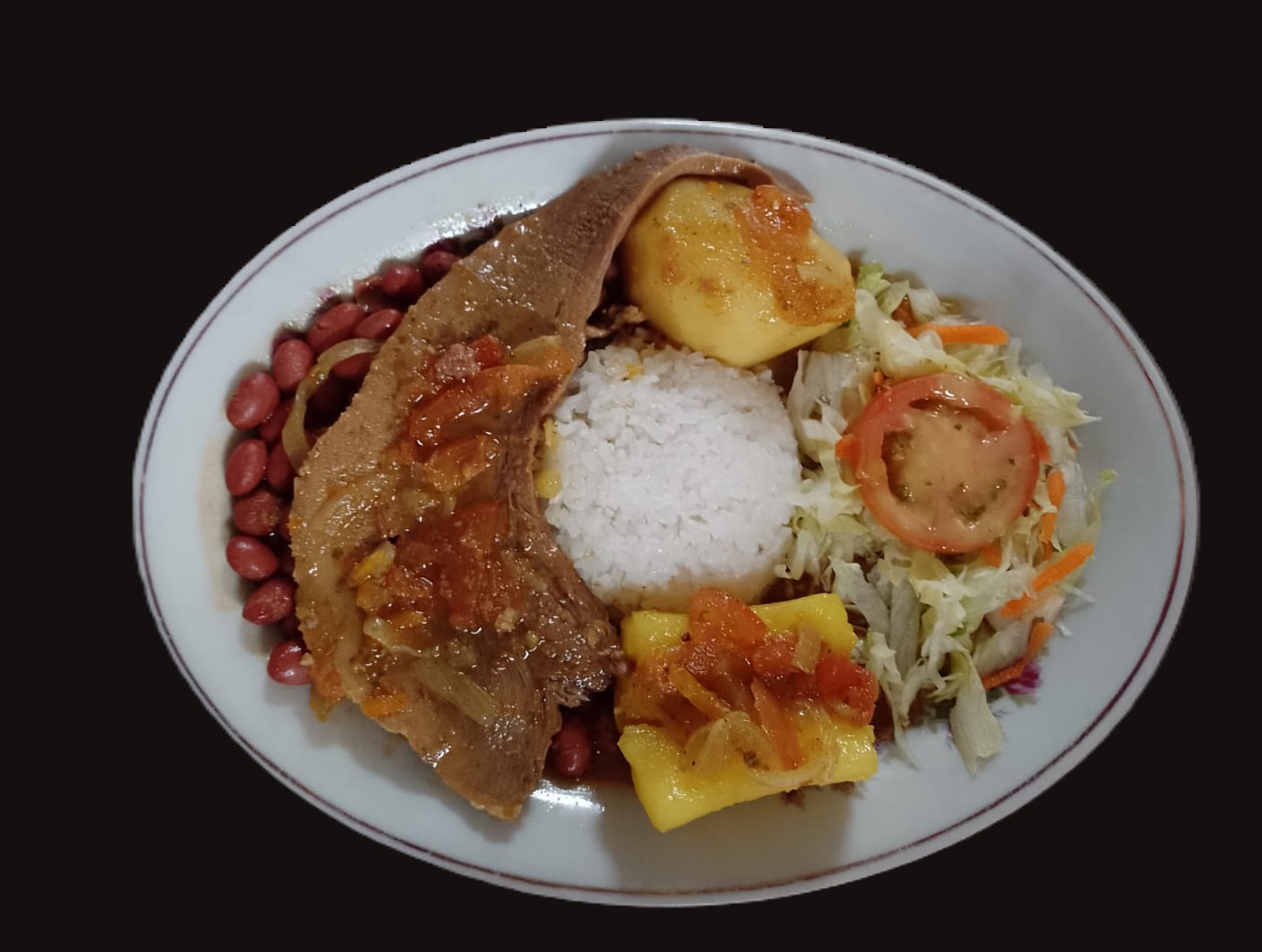 Bandeja con lengua, arroz blanco, ensalada (tomate, cebolla, lechuga), papa y yuca cocinada, sopa de frijol y bebida (limonada natural).