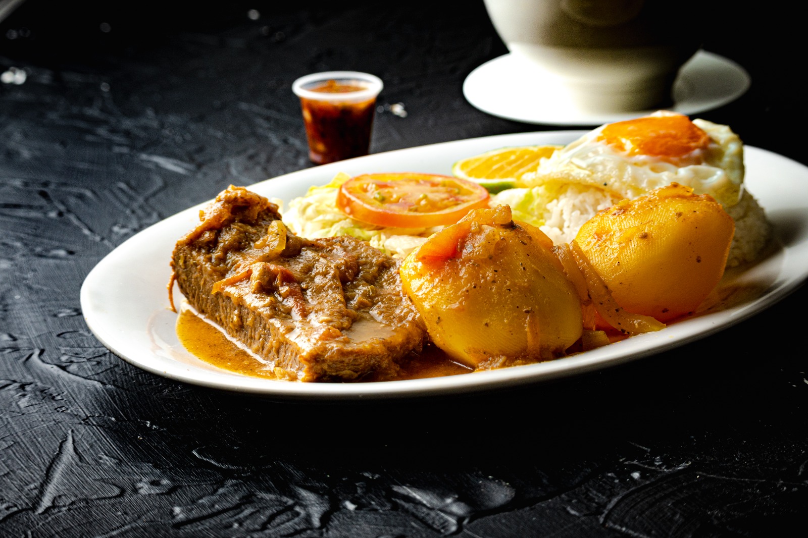 Calentado con posta sudada, huevo, arepa, quesito y bebida.