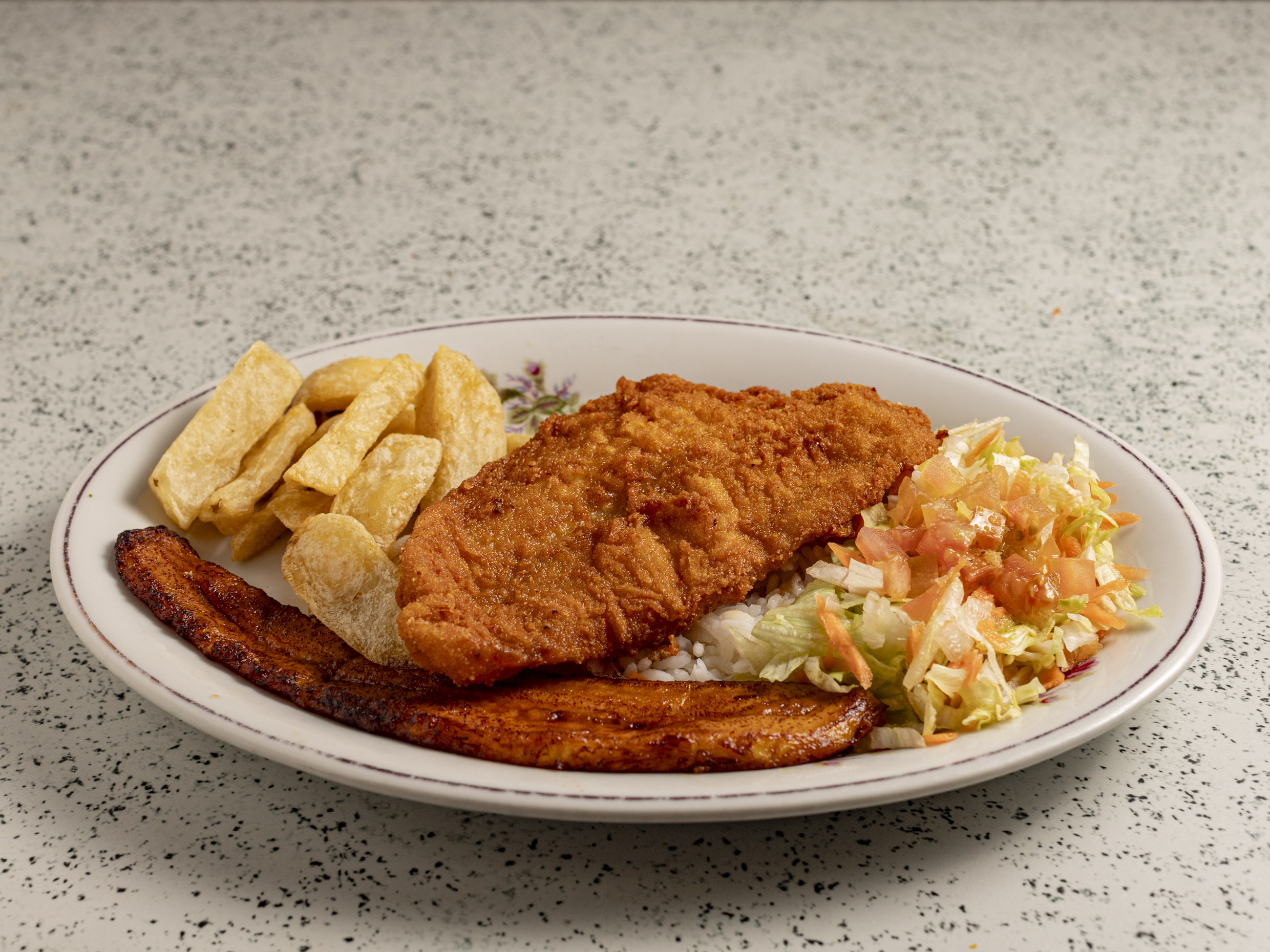 Pechuga de pollo, acompañada de papitas fritas, ensalada (tomate, lechuga), arepa y sobremesa.