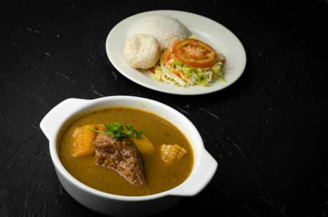 Plato de sancocho con carne de res, arroz, ensalada (tomate, cebolla, lechuga), bebida (limonada natural).