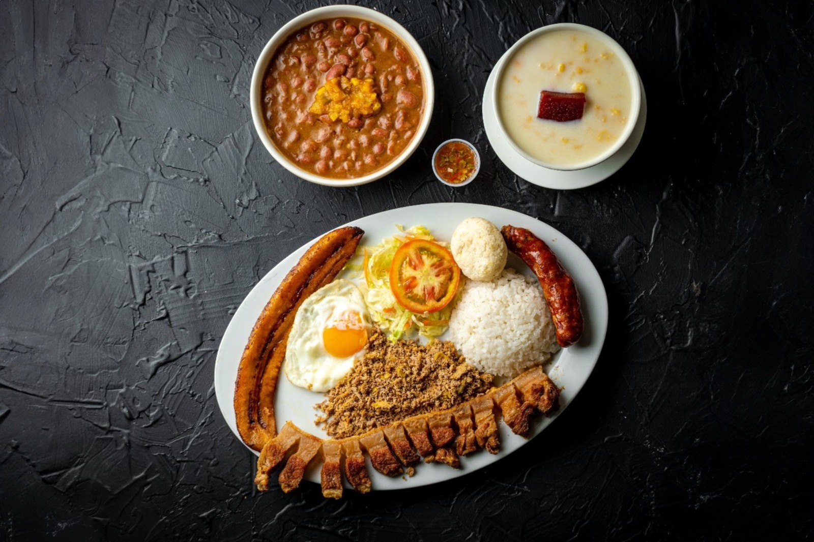 Cazuela de fríjoles con maduro picado, chicharrón picado, carne molida, ripio de papa, arepa, huevo, arroz y bebida (limonada natural).