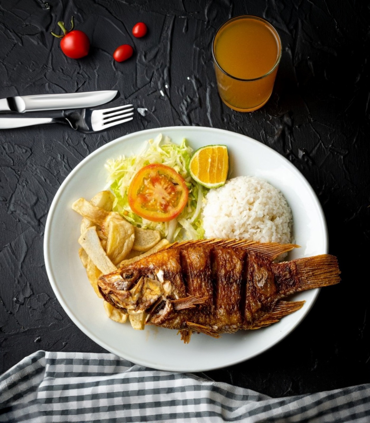 Pescado, acompañado de arroz blanco, ensalada (tomate, lechuga), papitas fritas con su bebida (limonada natural).