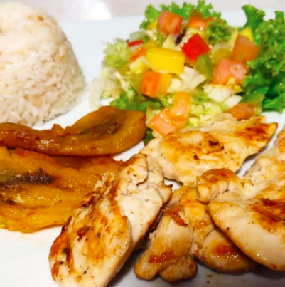 Pechuga de pollo, arroz blanco, maduro o papas a la francesa, ensalada y guarapo.