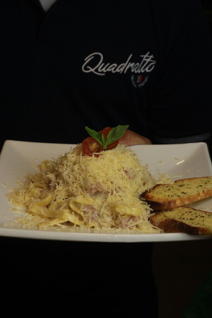 Tocineta, cebolla, crema de leche, huevo y parmesano