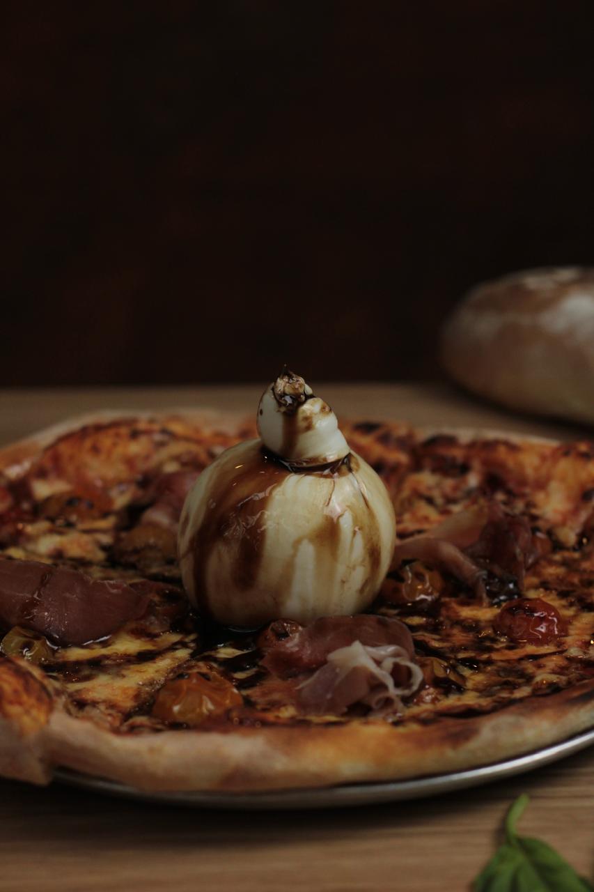 Base napolitana, mozzarella, tocineta ahumada, champiñones, huevo y balsámico.
