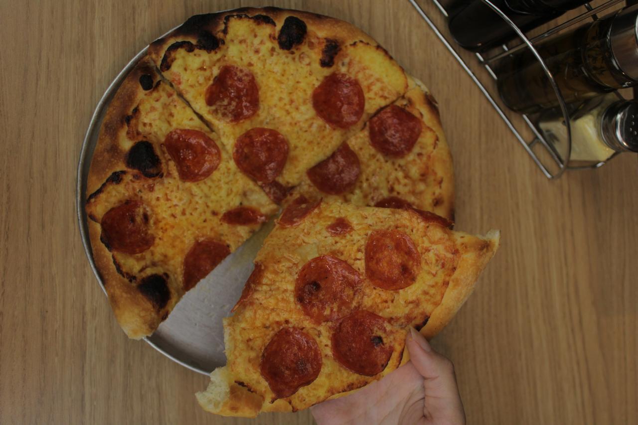 Base napolitana, mozzarella, pepperoni, pimentón negro, rúgula, tocineta, cebolla morada.