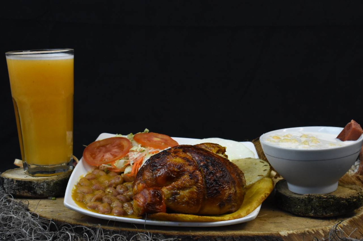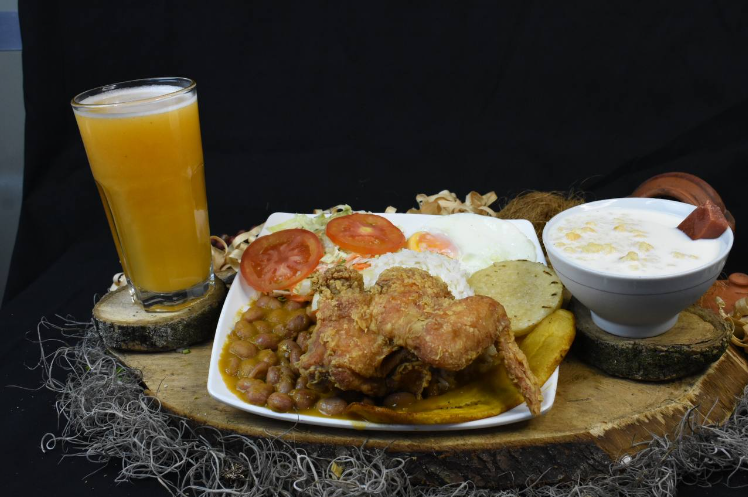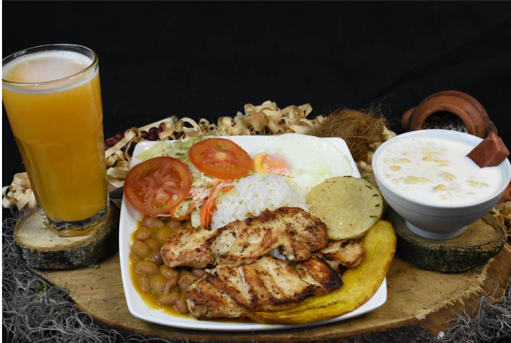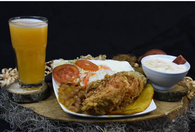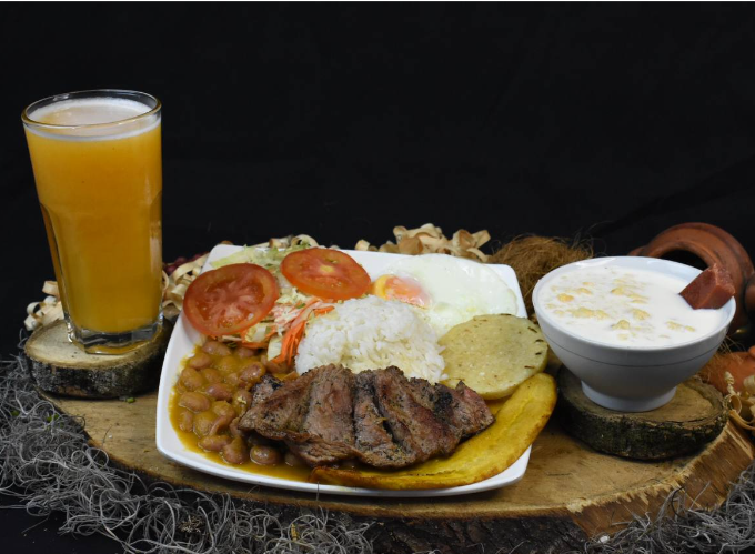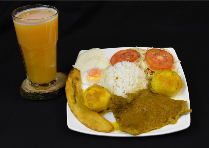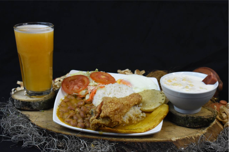 Acompañado de arroz, frijoles, ensalada del día, arepa frita y tajada de maduro. También trae la sopa y la bebida que es jugo del día.