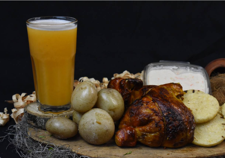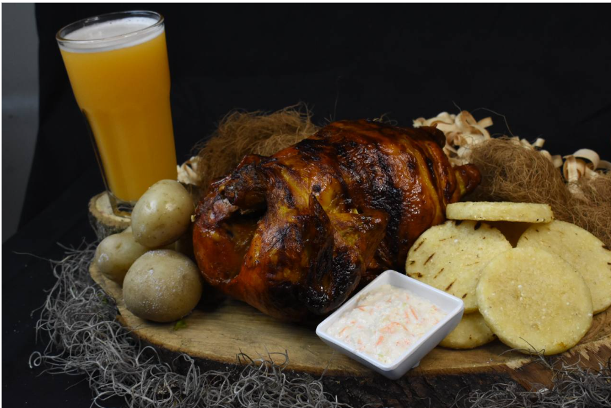 Pollo asado completo. Trae 8 papas y 8 arepas, salsa y miel a elección.