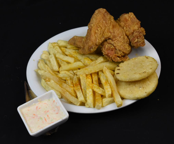 Ala, papa francesa, ensalada dulce y arepa frita.