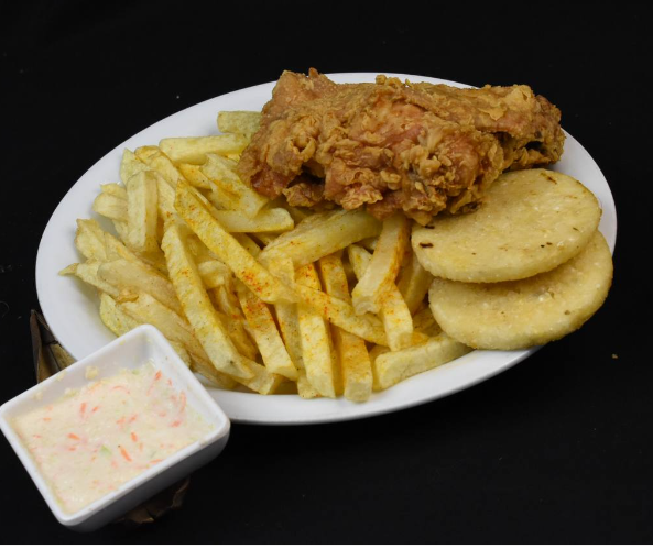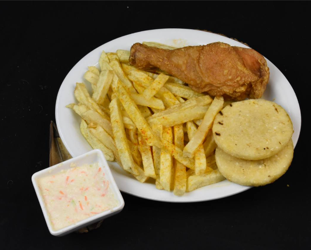 Muslo, papa francesa, ensalada dulce y arepa frita.