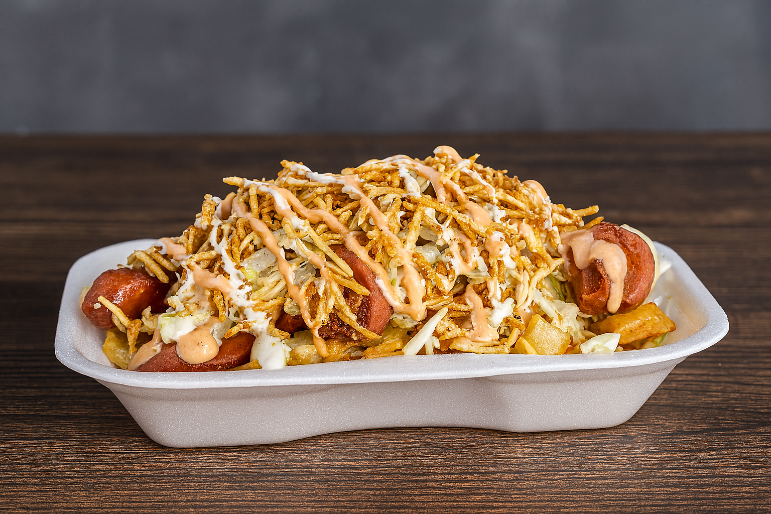 Salchipapa con papas a la francesa, queso, tocienta, butifarras, salchicha, pechuga, lechuga, papa ripio y salsas