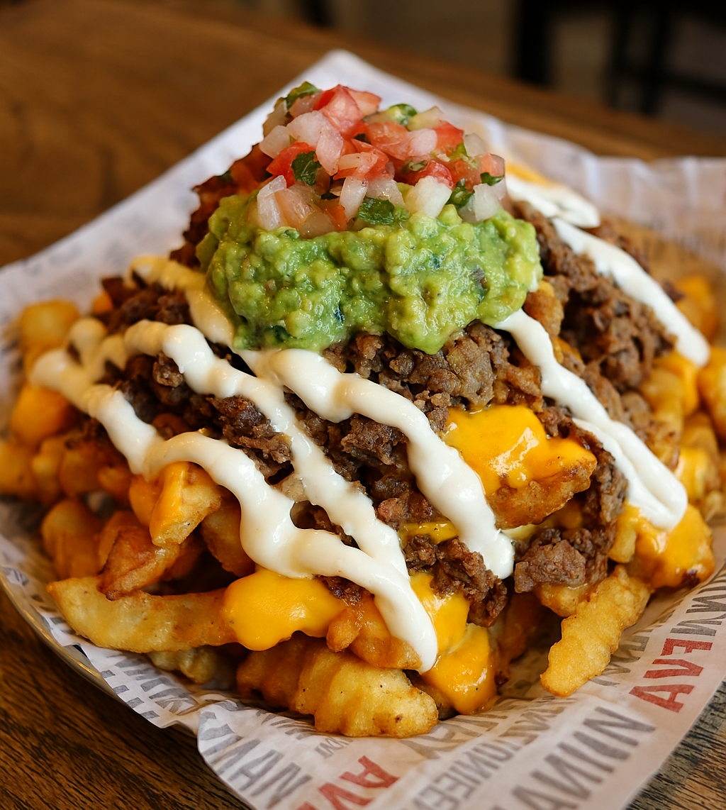 Papas mexicanas con papas a la francesa, queso, tocineta, carne desmechada, guacamole, sour cream, pico de gallo y salsas