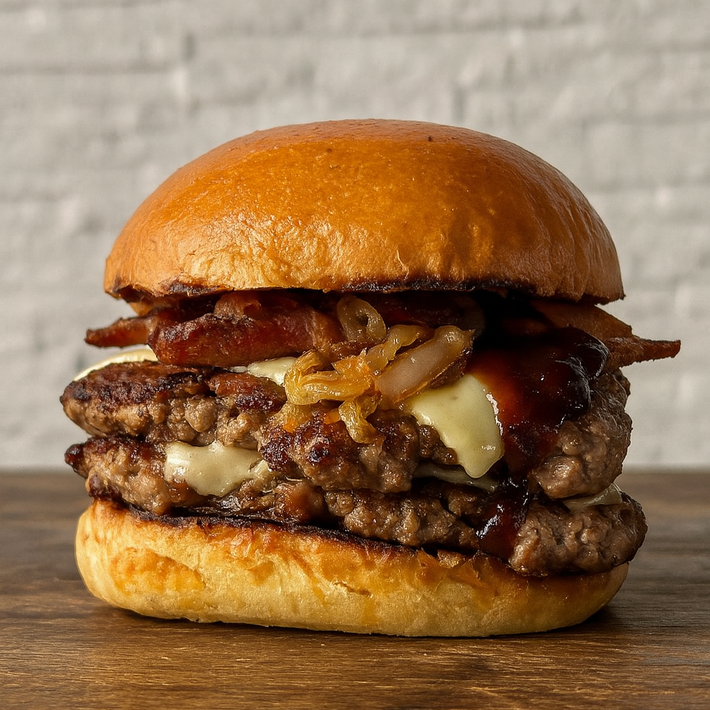 Pan de hamburguesa suave, doble carne 100 % res artesanal, doble queso mozzarella, cebolla caramelizada salsas de la casa