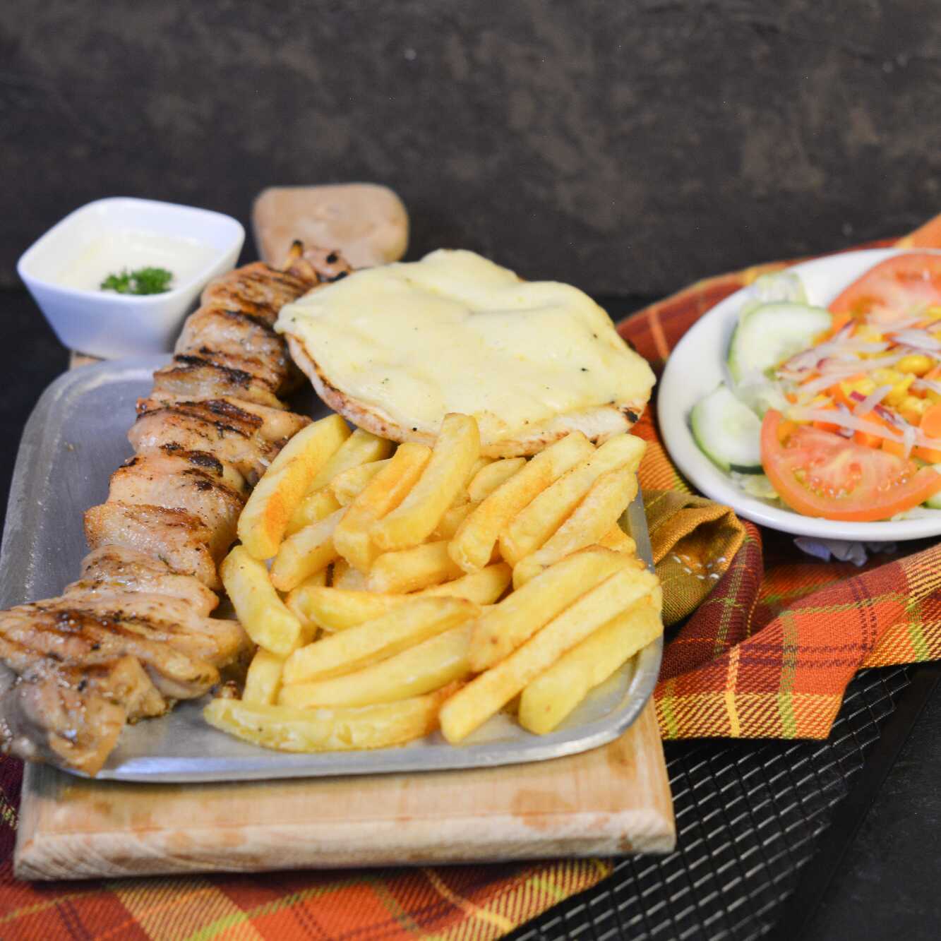 Chuzo de 250 gramos, acompañado de papas a la francesa y arepa con queso mozarela.