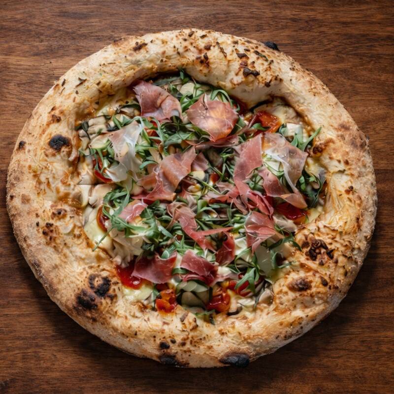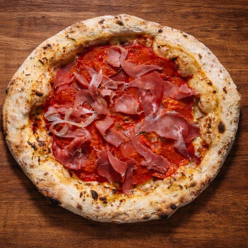 Masa madurada, salsa pomodoro, mozarella, jamon, chorizo, pepperoni, parmesano