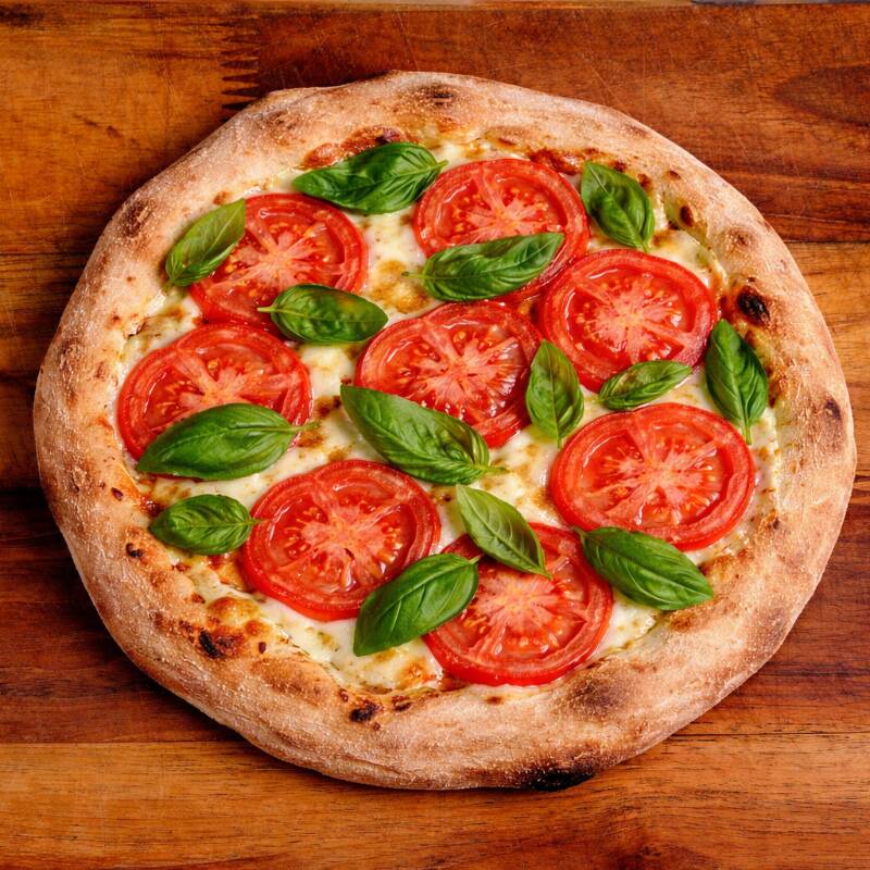 Masa madurada, salsa pomodoro, mozarella, tomate y albahaca