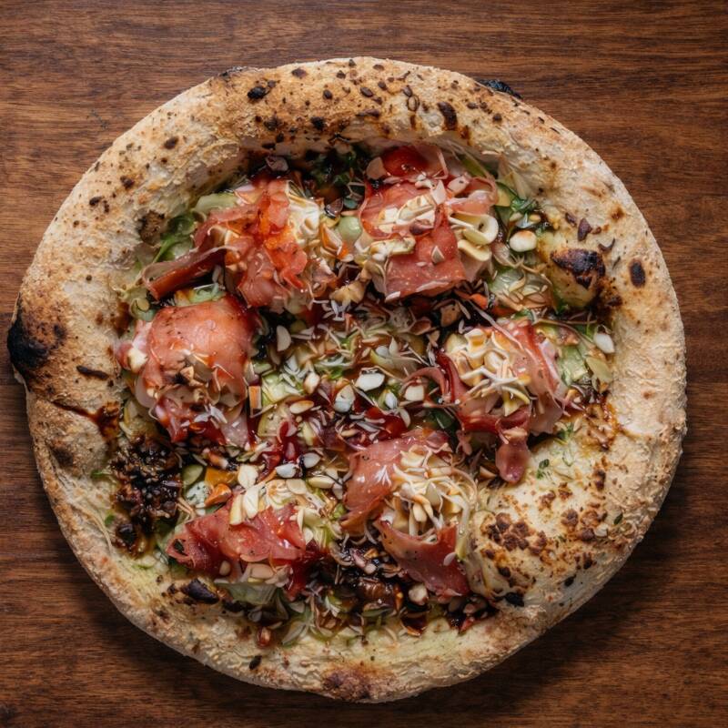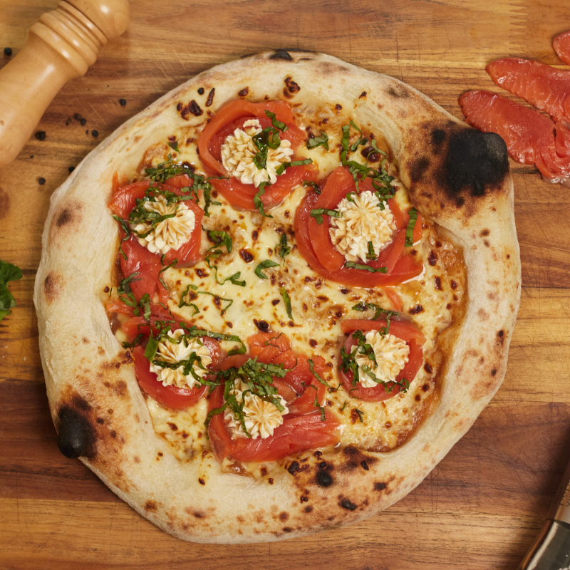 Masa madurada, salsa pomodoro, mozarella, Salmon madurado, queso crema, albahaca fresca y reducción de balsámico
