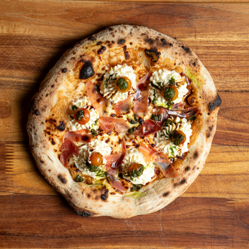 Masa madurada, salsa pomodoro, mozarella, tocineta, tomate, albahaca, parmesano y queso crema