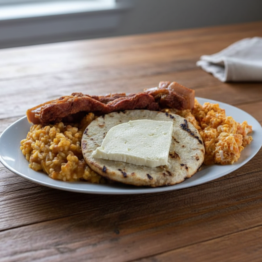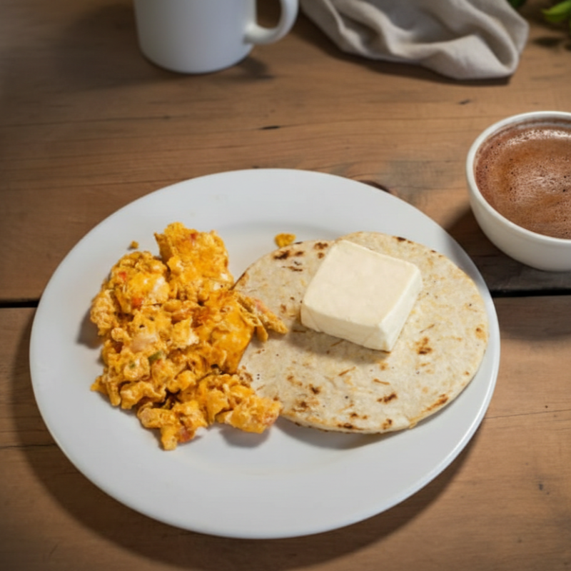 Huevos, arepa ó pan quesito, chocolate o guarapo o café con leche