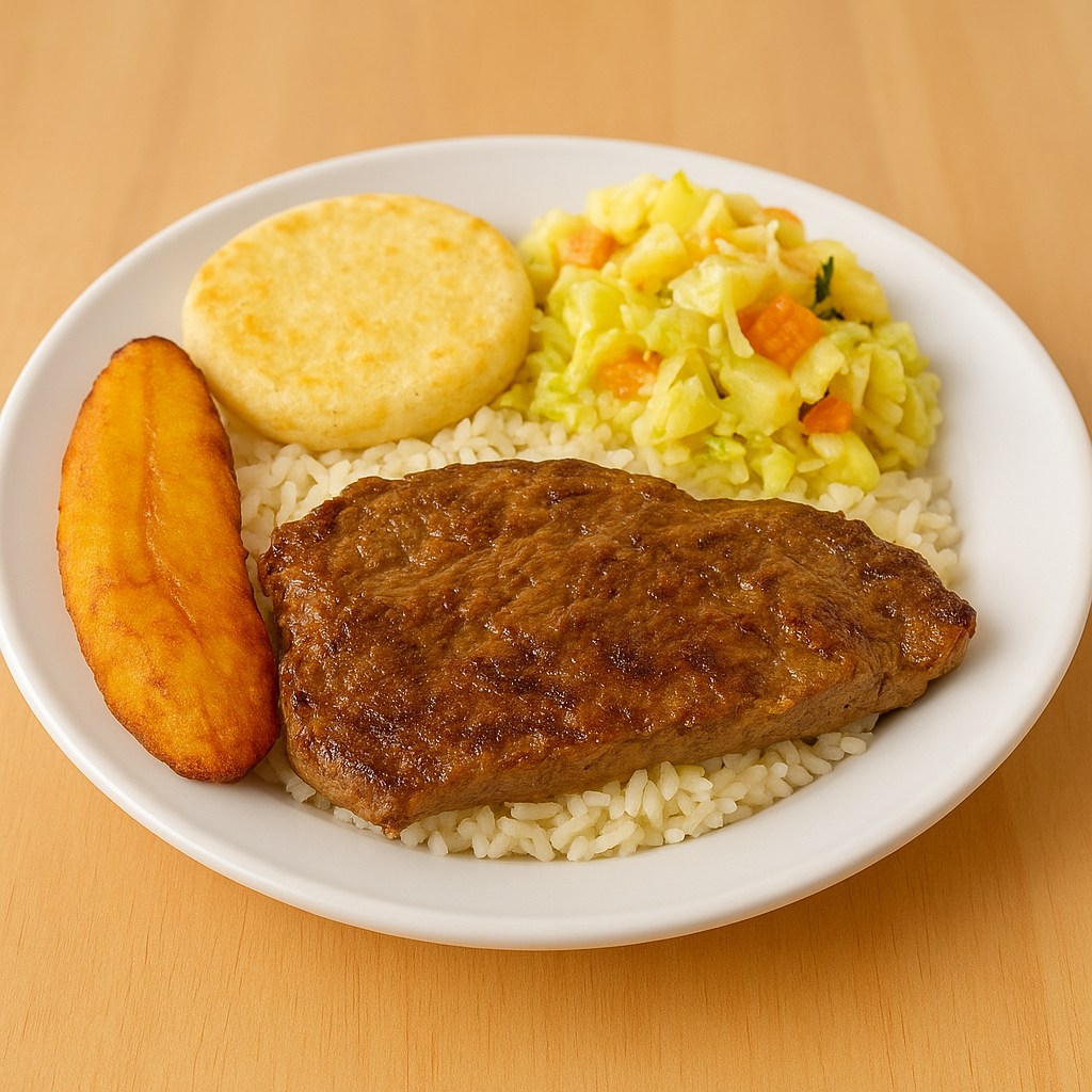 Sopa 8 onzas tajada de maduro arepa ensalada proteína aleccion y jugo