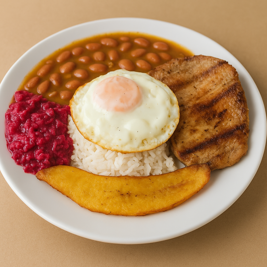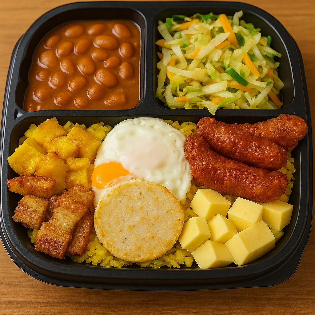 Acompañado de: frijol, arroz, chicharrón picado, chorizo picado, tajada de maduro picado, huevo, arepa aguacate y bebida jugo o guarap
