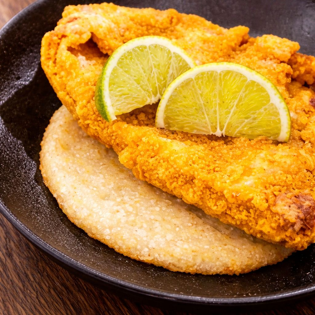 😋Torta de pescado de robalo apanado + arepa frita. ¡Deliciosa!