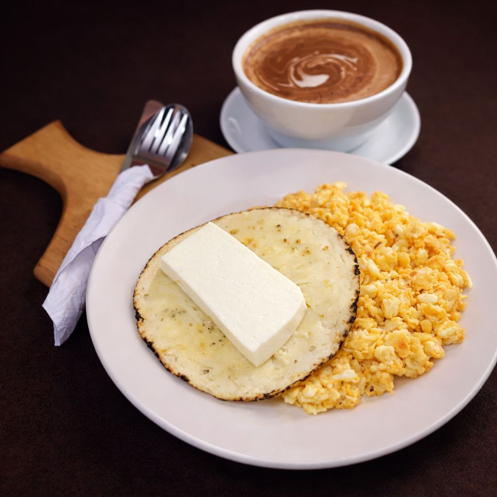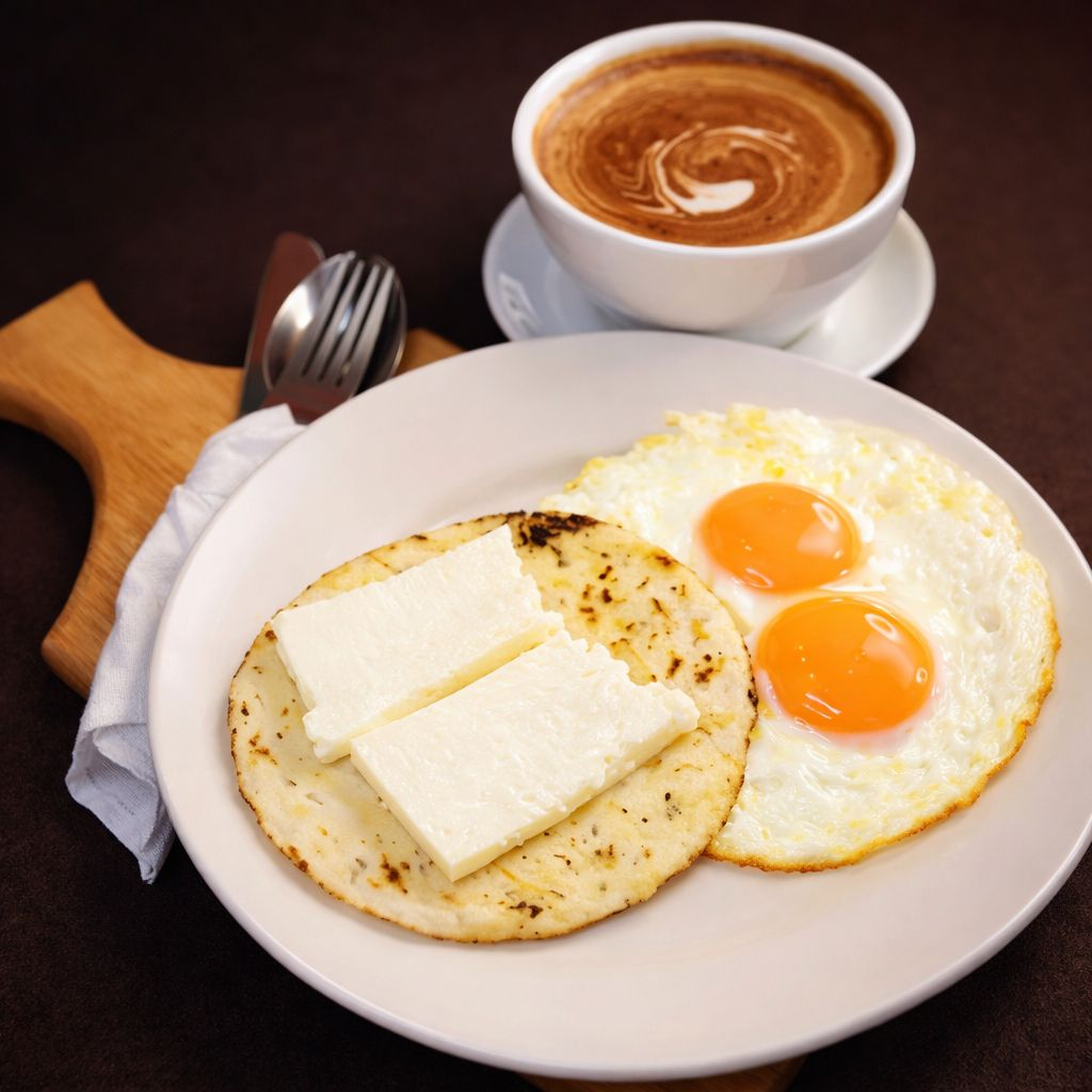 Sí al desayuno casero de Ricuras. Arepita con quesito cuajada, huevos enteros y chocolate negro.