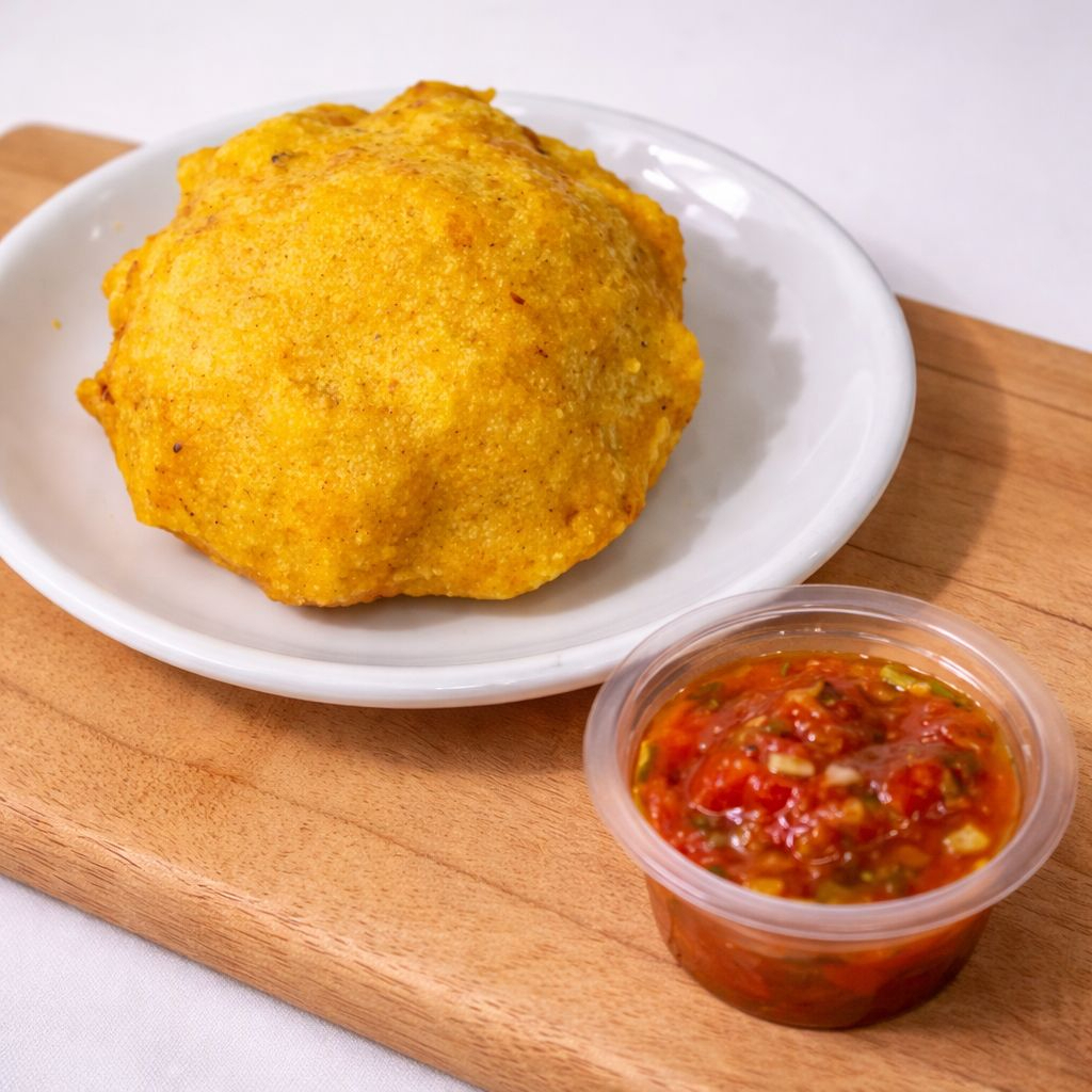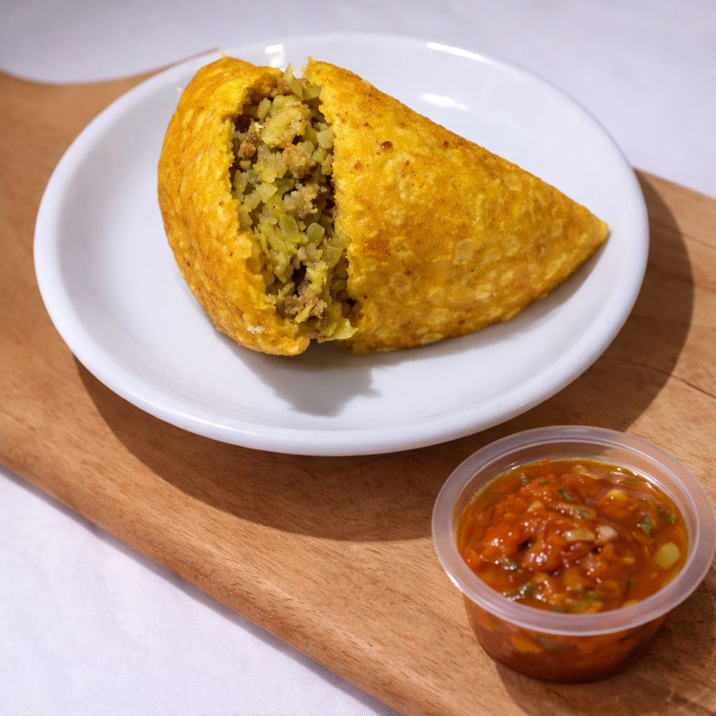 Rica empanada hecha a base de maíz, rellena de guiso, arroz y papa.