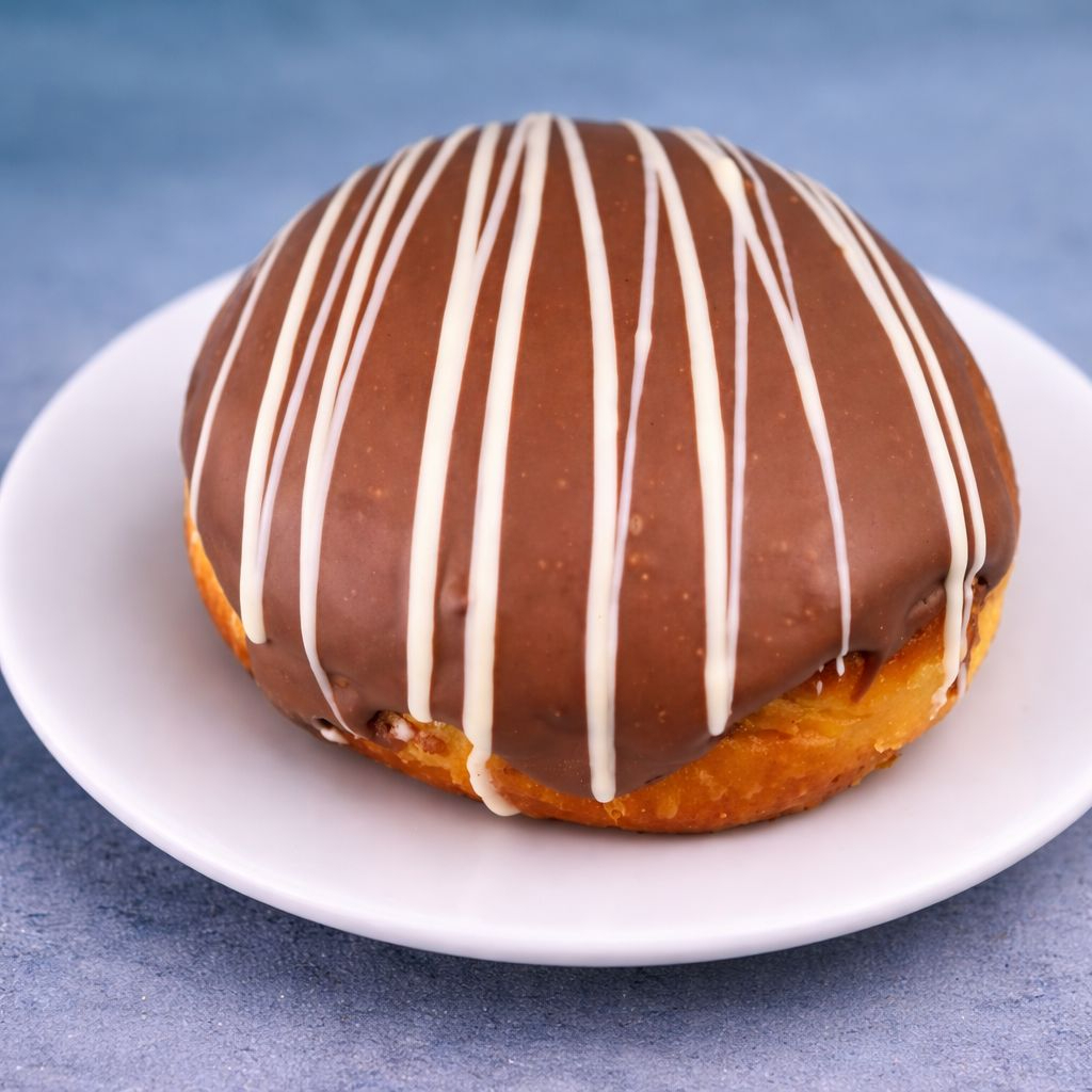 Qué deliciosa es nuestra dona de chocolate, rellena con crema pastelera o arequipe.