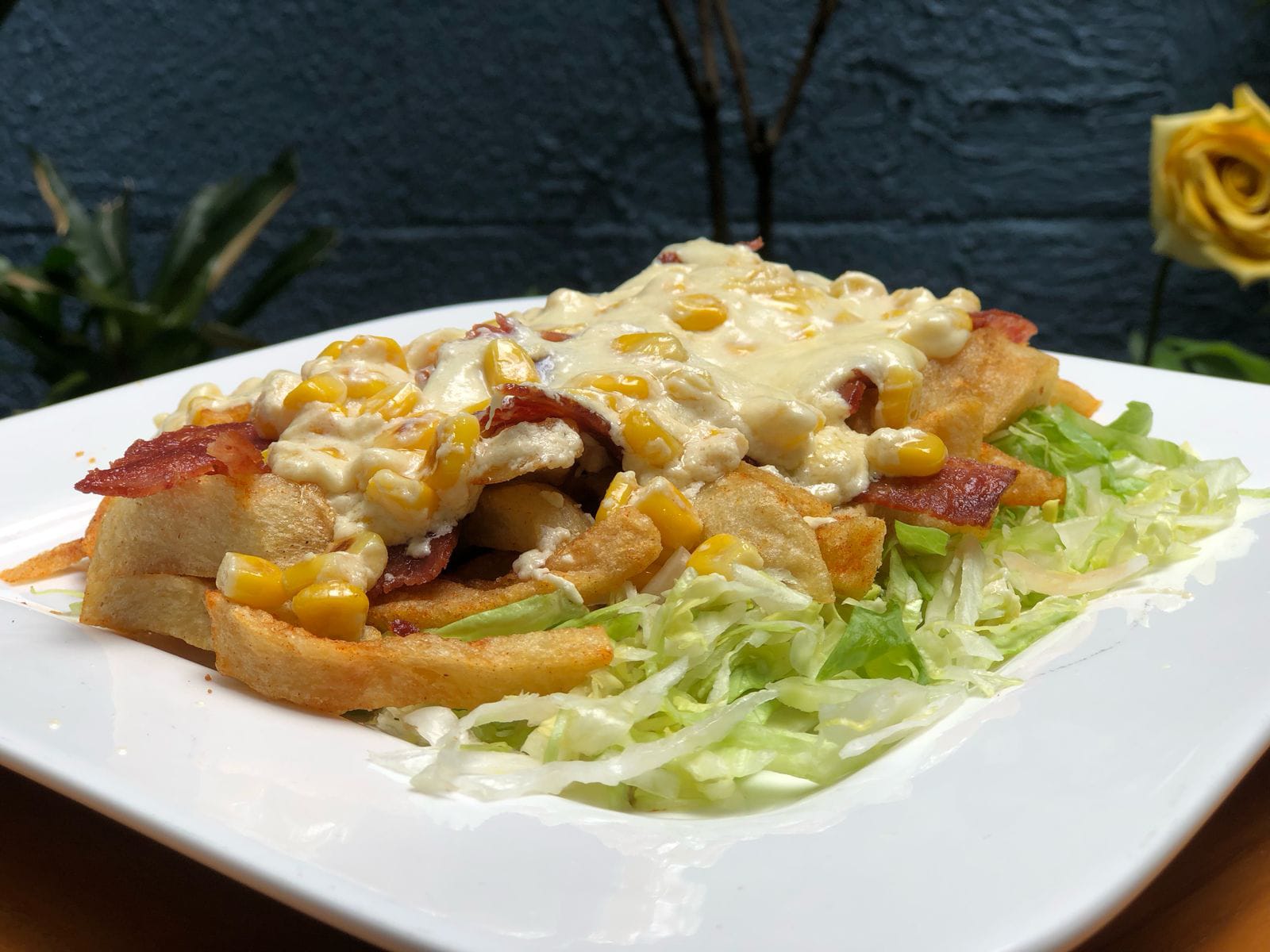 Trozos de tocineta ahumada con salsa de queso y maíz artesanal, papas y lechuga fresca.