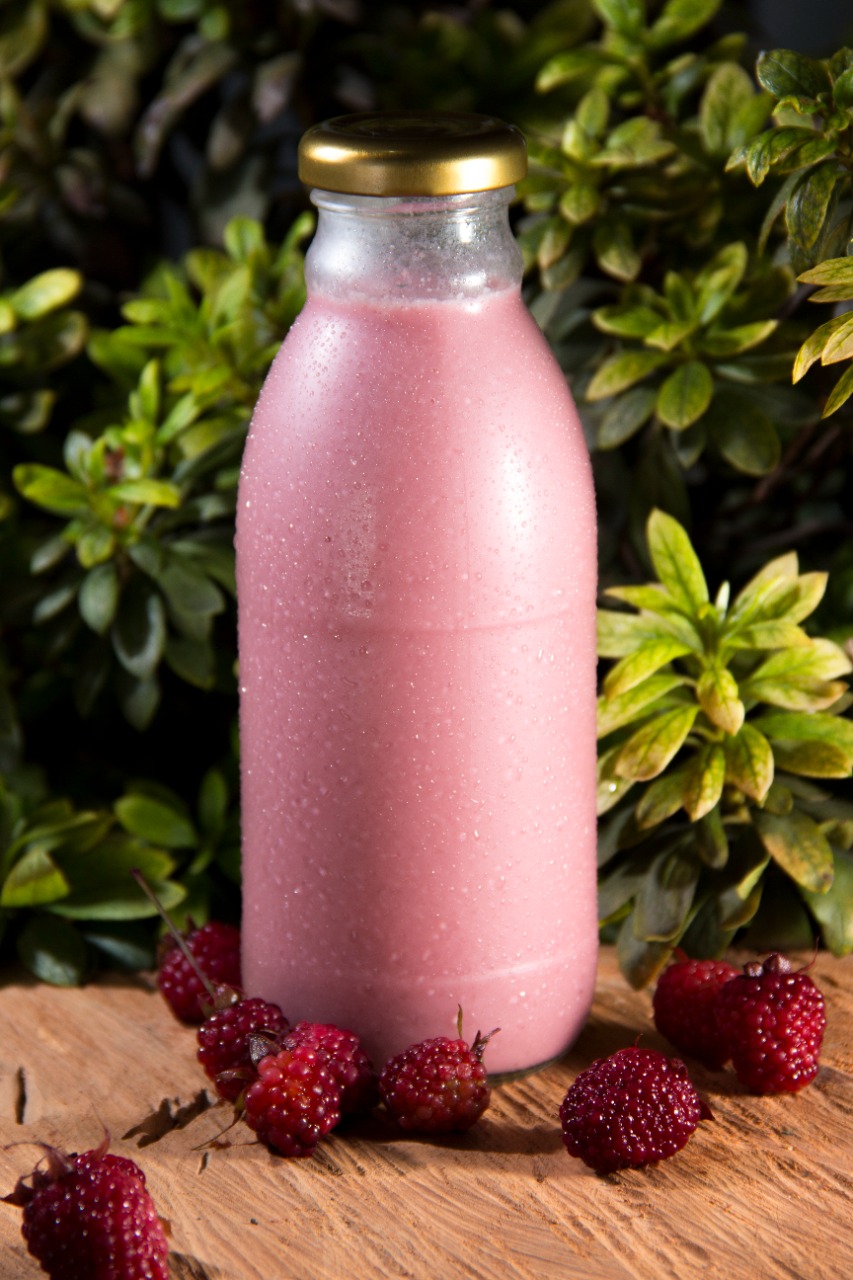 Bebida a base de kumis con pulpa natural de mora, endulzada con azúcar morena.