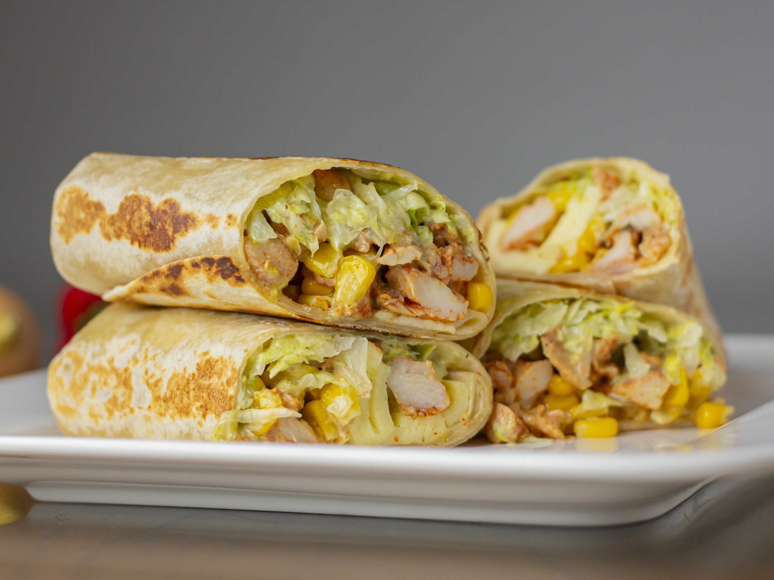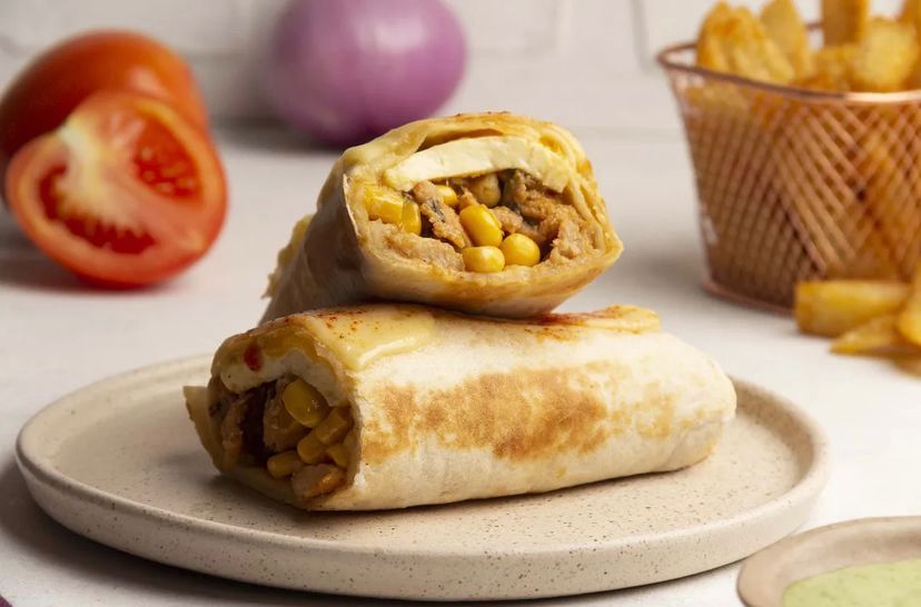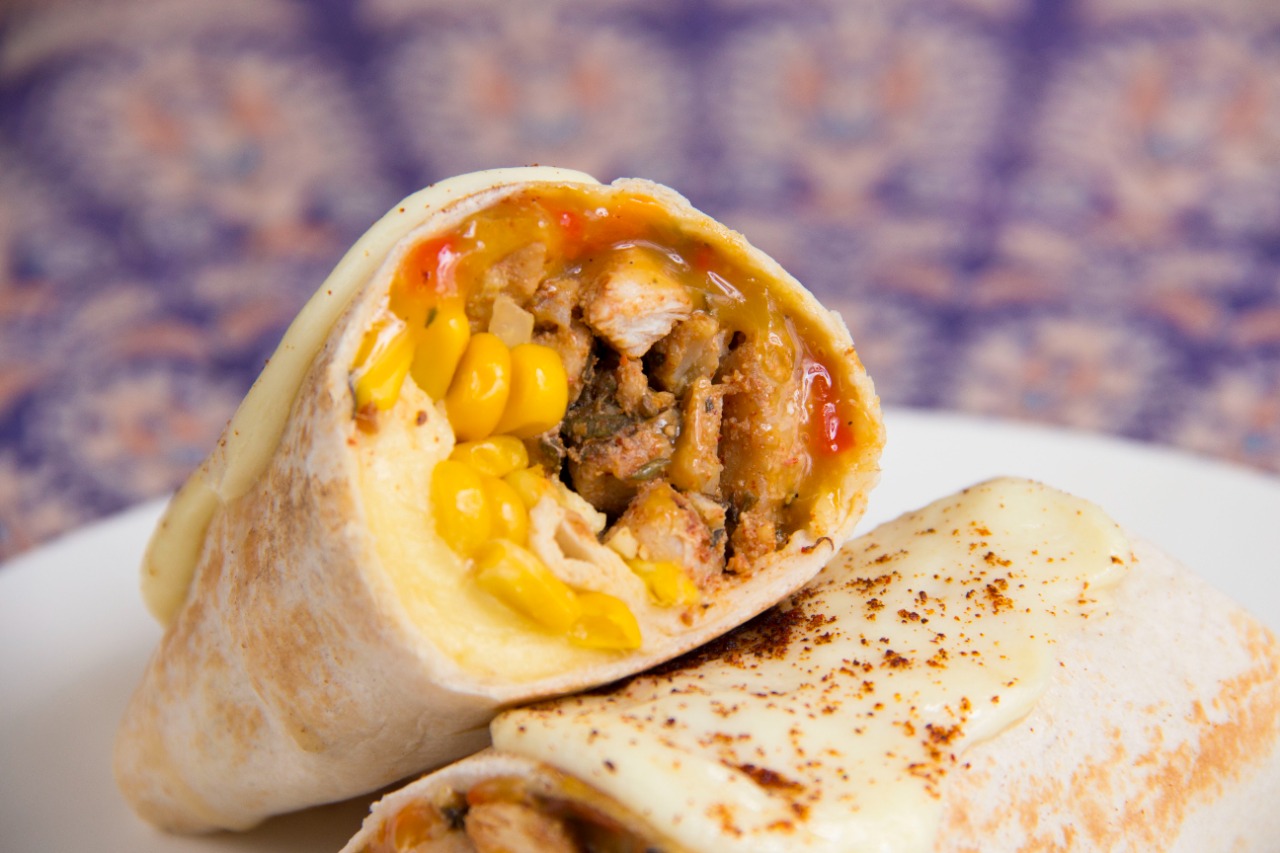 Delicioso burrito con Pollo en trozos, lechuga Batavia, maicitos, queso mozzarella y salsa de la casa (mayonesa aromatizada en ajo con cilantro).