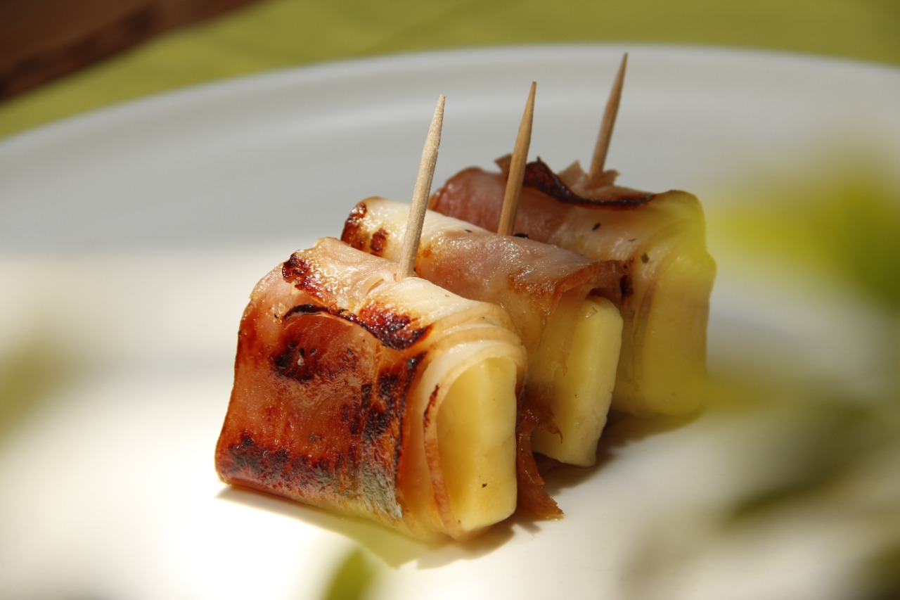 3 Rollitos de tocineta con queso papialpa marinados en miel y pimienta.