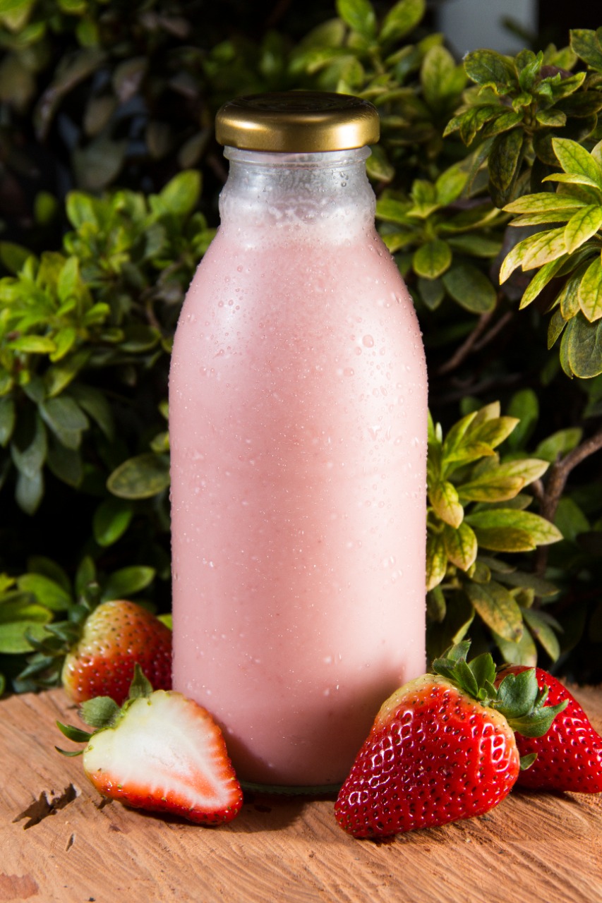 Bebidas a base de kumis con pulpa natural de fresa, endulzada con azúcar morena.
