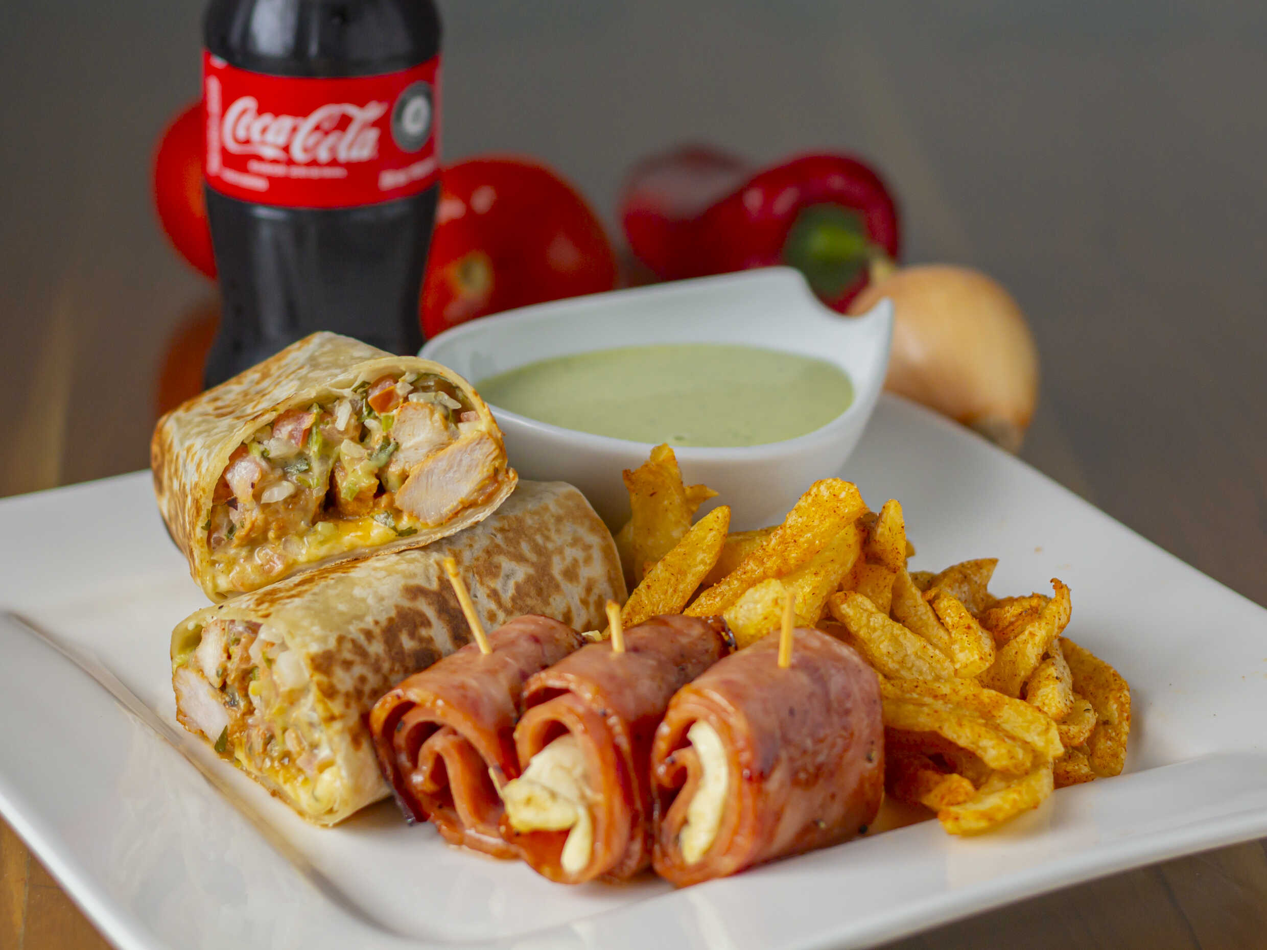 Mayonesa artesanal, pico de gallo, guacamole, 60 gr de pollo, 60 gr de cerdo, queso mozzarella.+ papas a la francesa 120 gramos ( peso en crudo) y salsa de la casa