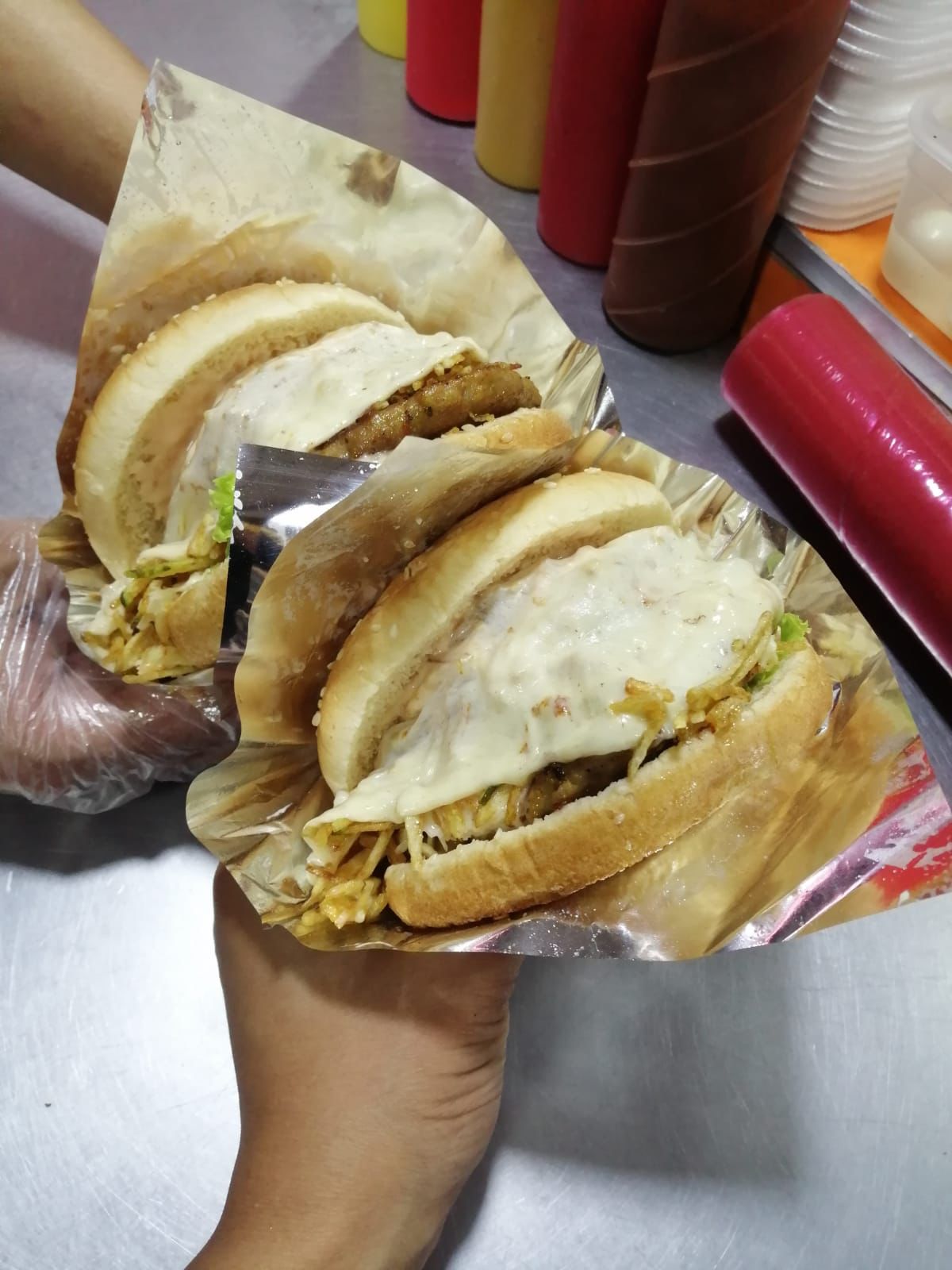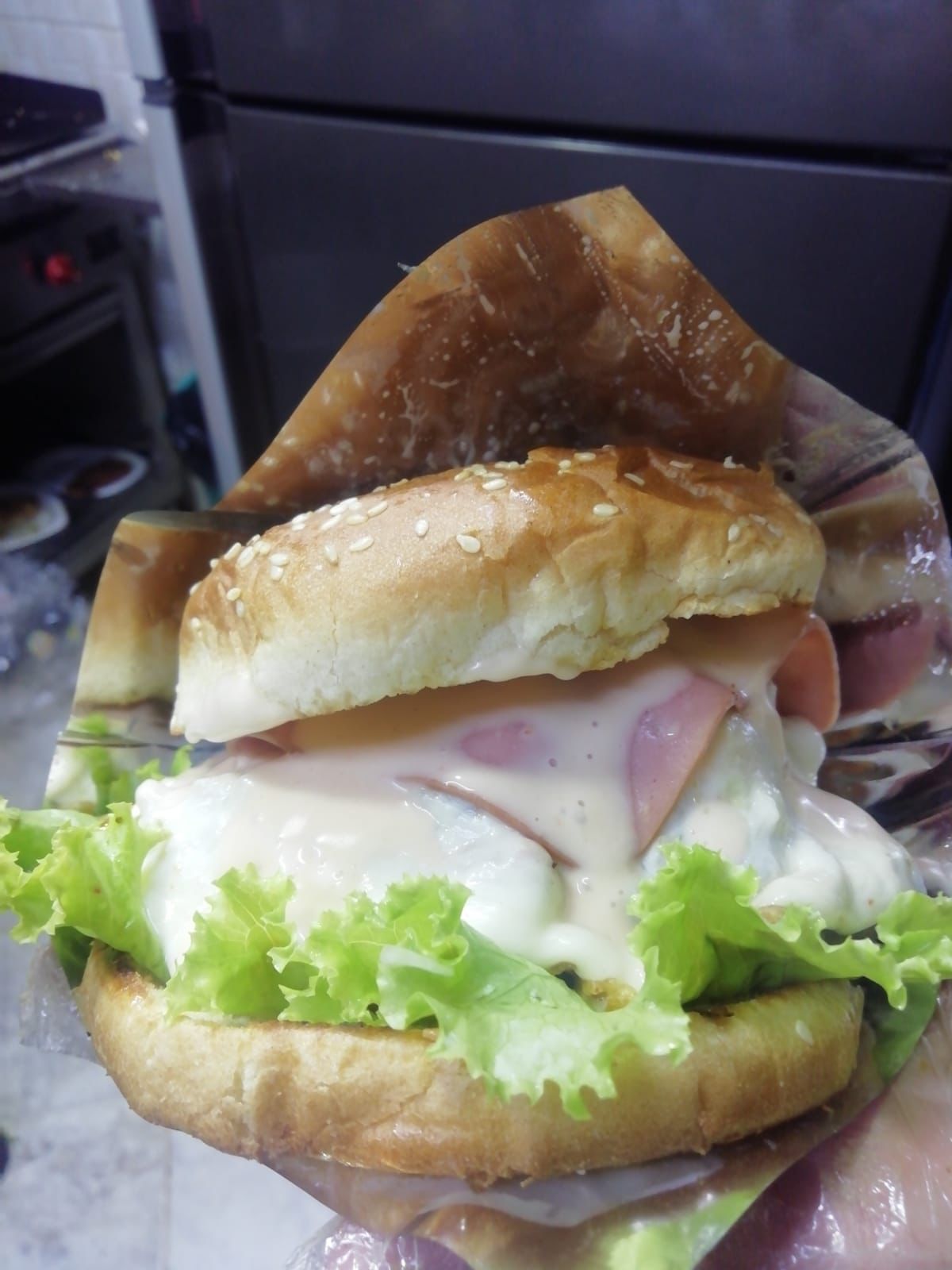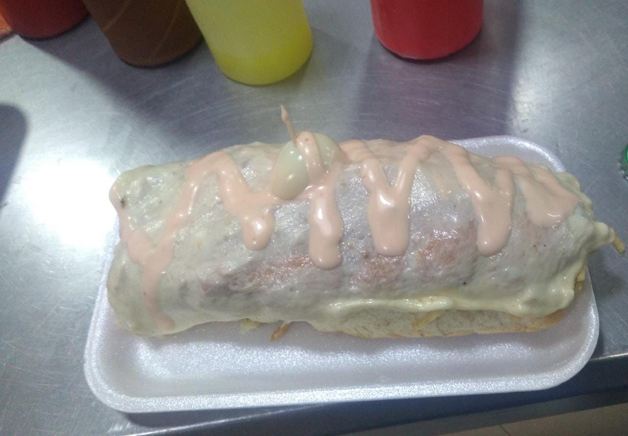Pan carne desmechada queso mozarela jamón tocineta lechuga tomate y maicitos