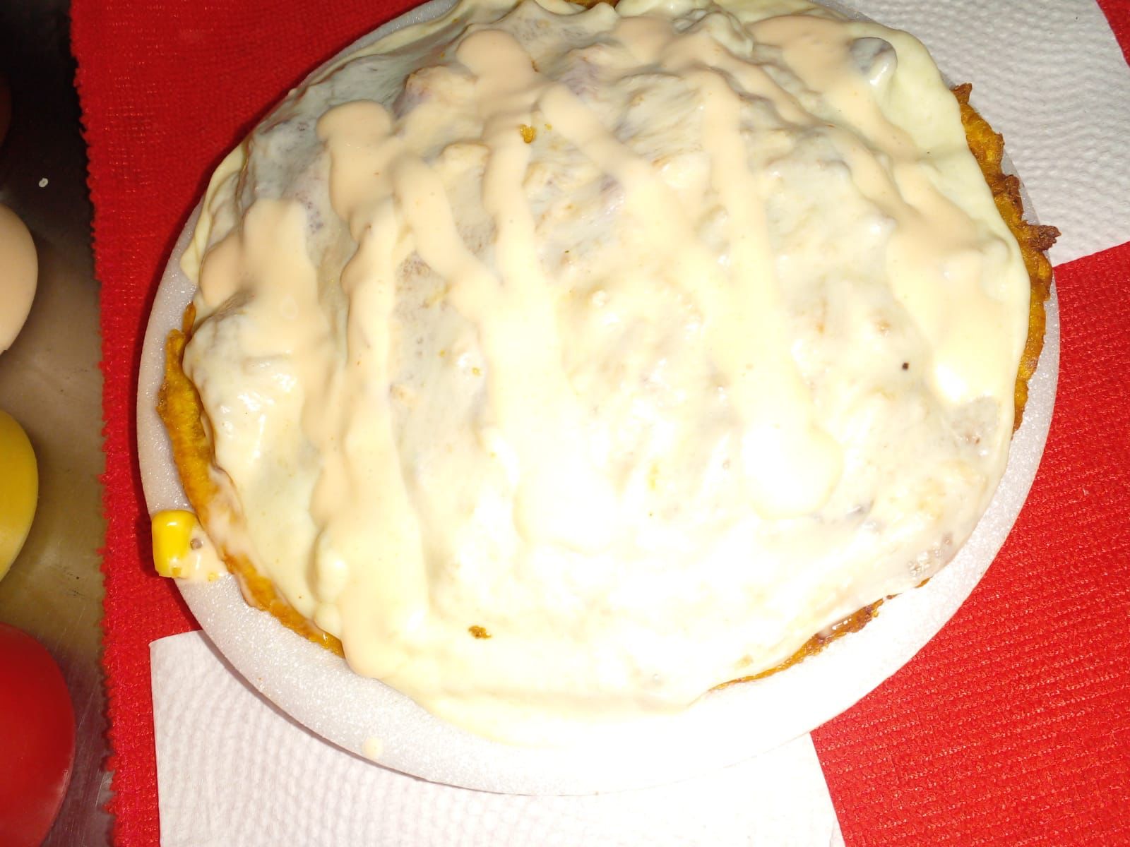 Patacón pollo desmechada maicitos tocineta ensalada de repollo ripio de papa queso mozarela