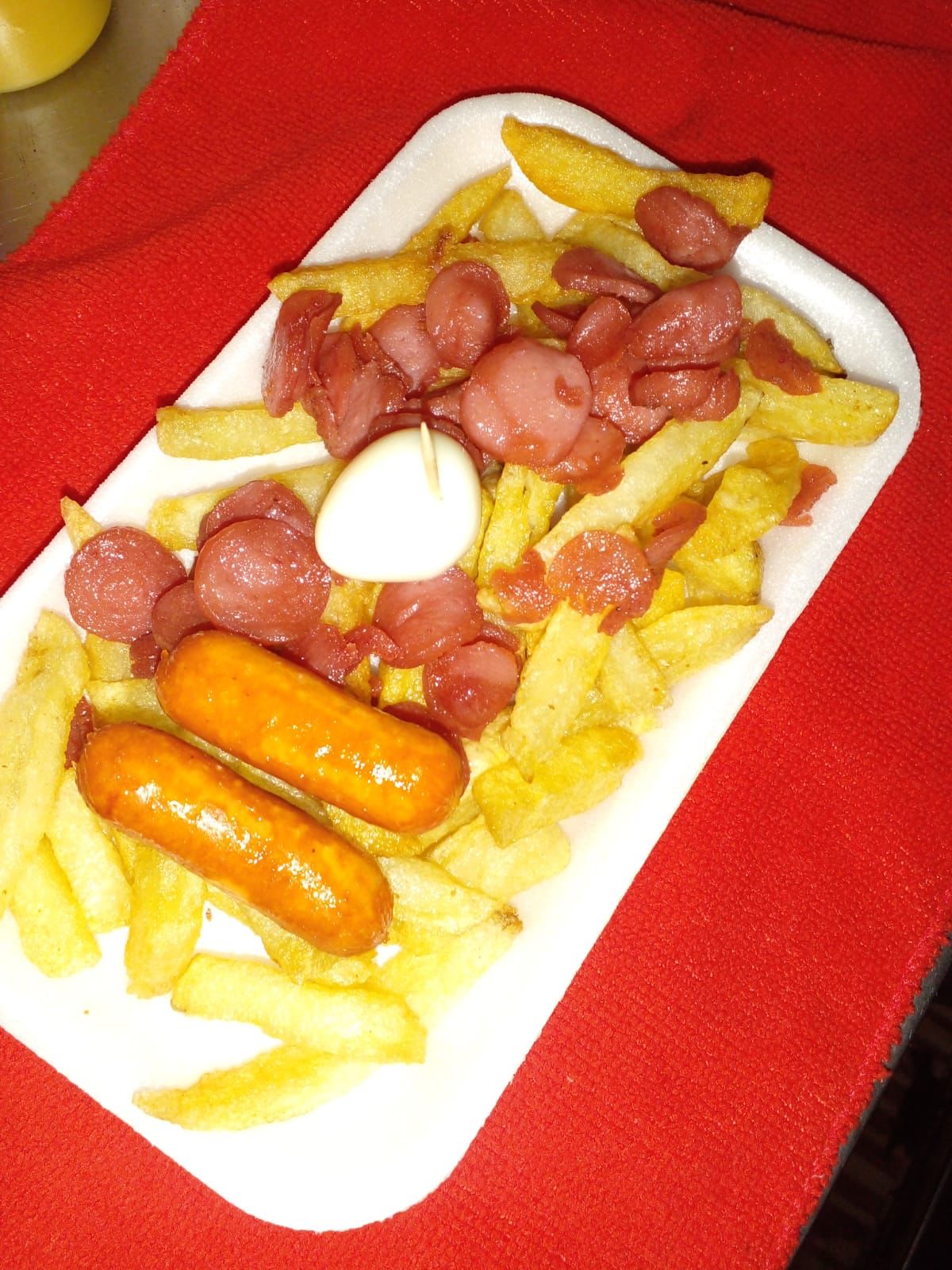 Papa a la francesa salchicha picada chorizo coctel huevo de codorniz chorizo de ternera arepa y ensalada de repollo