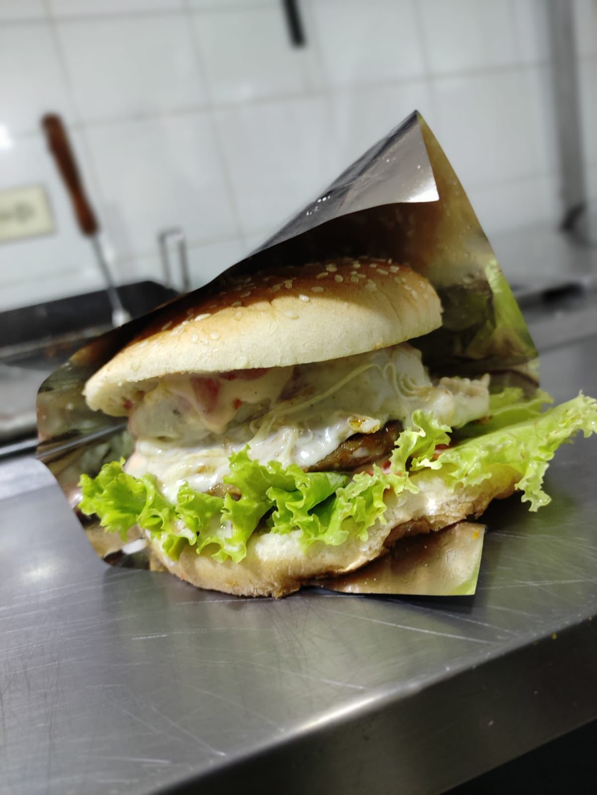 Doble Filete de pollo, tocineta queso mozarela ensalada de repollo lechiga tomate y ripio de papa