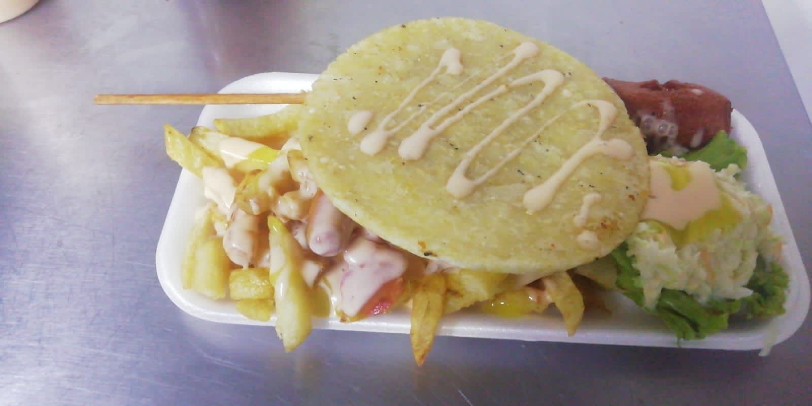 Arepa Carne tocineta queso mozarela ensalada de repollo ripio de papa y papas a la francesa
