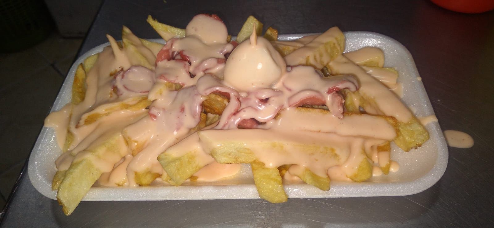 Papa a la francesa pollo desmechado salchicha picada chorizo coctel queso mozarela y queso mozarela