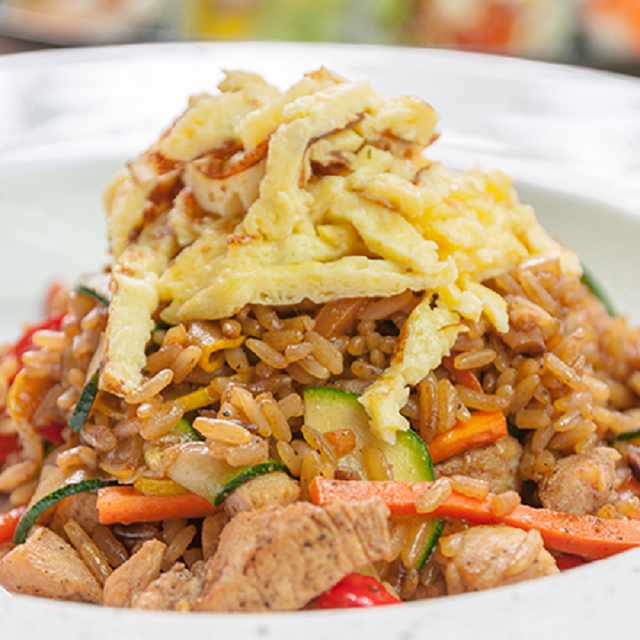 Arroz al estilo japonés con pollo, tortilla de huevo y vegetales frescos bañados en salsa de soya.
