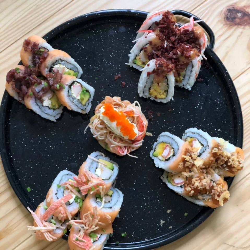Sushi de salmón, kanikama, queso crema, aguacate, plátano maduro y puerro crunch, bañado con salsa teriyaki y mayonesa de sriracha.