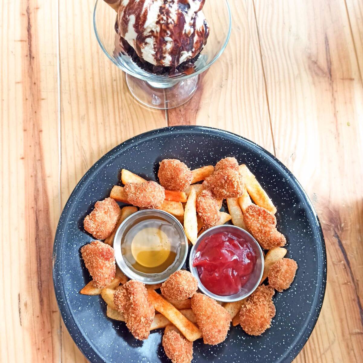 Pollo crunch con papas a la francesa, salsa de tomate y de miel. acompañado de limonada natural.