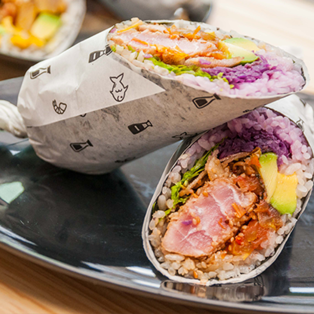 Burrito de sushi con atún marinado en soya, aguacate, champiñones, zanahoria, cebolla crunch, mayonesa de albahaca, alga nori, arroz y lechuga.
