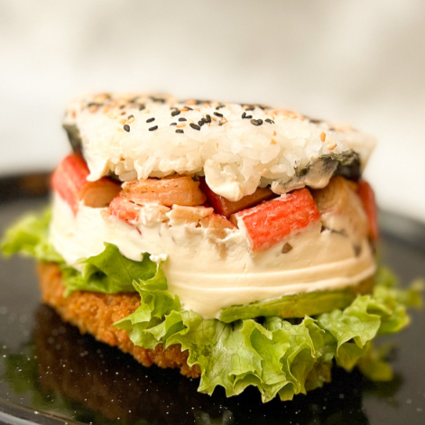 Hamburguesa de sushi con salmón marinado, kanikama, tocineta caramelizada en reducción de vino tinto, cebollín, lechuga, aguacate, alga nori y salsa agridulce. Una tapa de arroz crunch y la otra fresca.