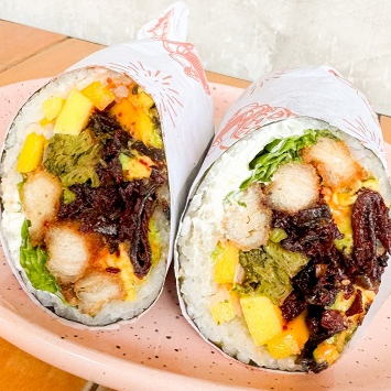 Burrito de sushi con camarones salteados, kanikama, ceviche de mango, queso crema, aguacate, vegetales crunch y salsa de ajonjolí.